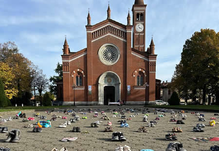 Verderio: sagrato ricoperto di scarpe ricordando i bimbi di Gaza morti per la guerra