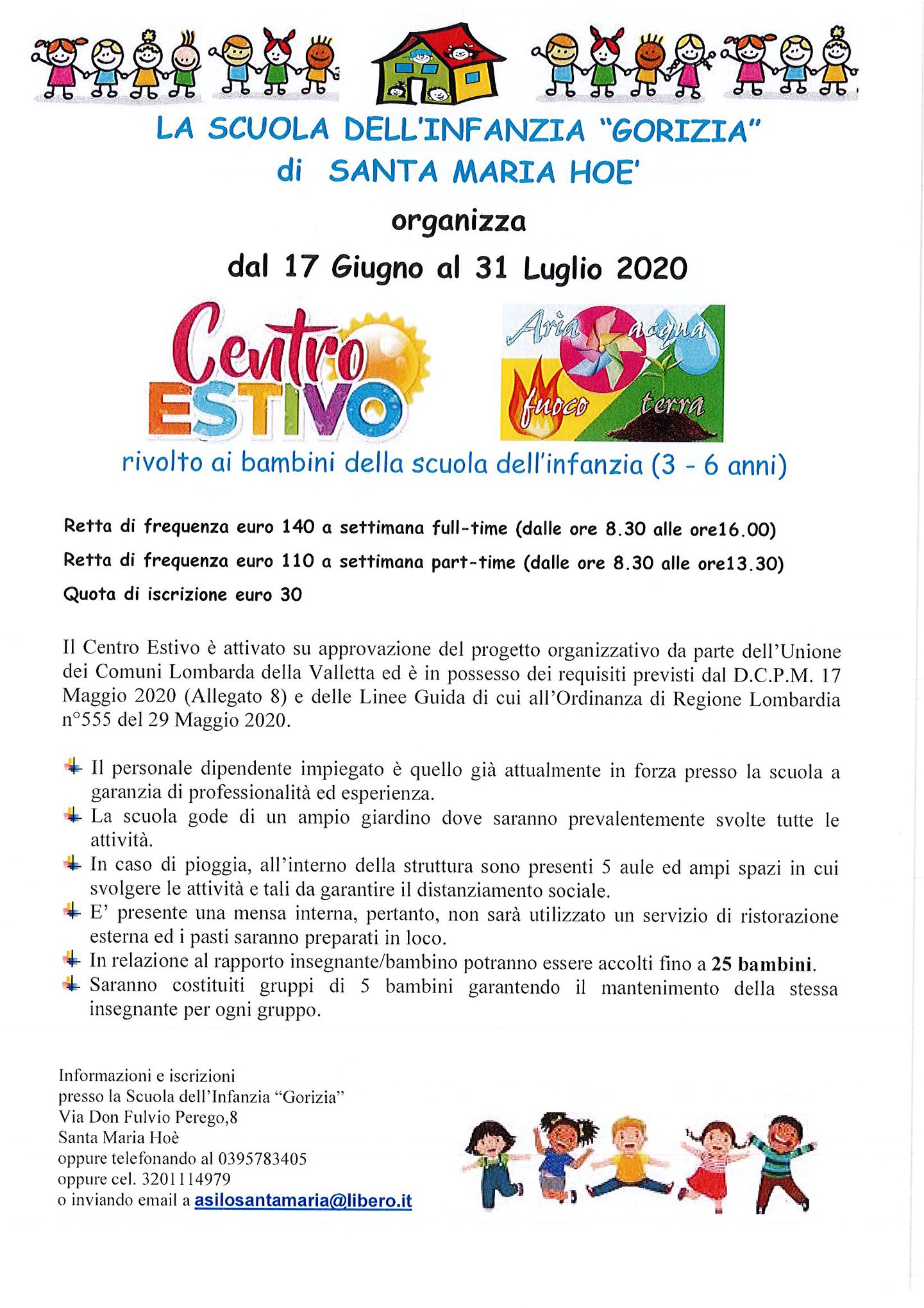 La scuola dell'infanzia "Gorizia" di Santa Maria Hoè è ufficialmente pronta a riaprire i battenti. A partire da mercoledì 17 giugno, infatti, l'asilo ospiterà il centro estivo riservato ai bimbi dai 3 ai 6 anni, che resterà aperto fino al 31 luglio. La scuola di via don Fulvio Perego si è attrezzata per ospitare un massimo di 25 bambini, che verranno divisi in gruppi da 5 e coordinati per tutto il tempo dalla medesima insegnante. Le famiglie potranno optare per iscrivere i loro piccoli al tempo pieno - dalle 8.30 alle 16 - oppure solo per metà giornata, dunque fino alle 13.30. La retta di frequenza sarà di 140€ a settimana per il full time e di 110€ per il part time, con una quota di iscrizione di 30€.