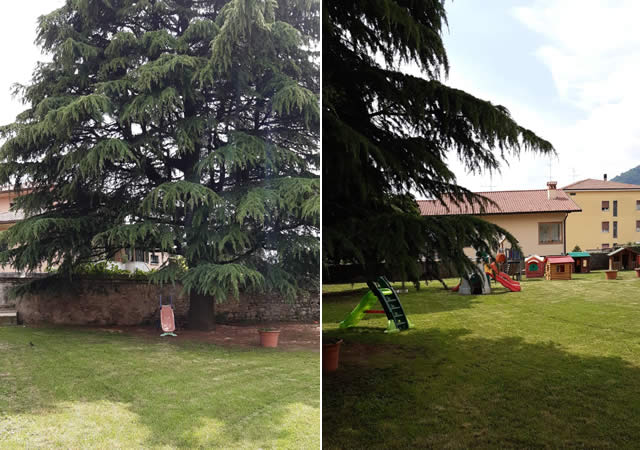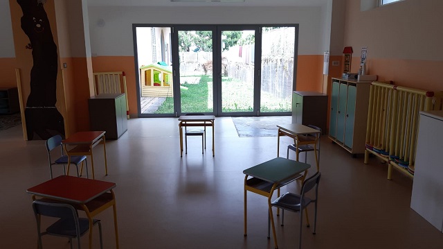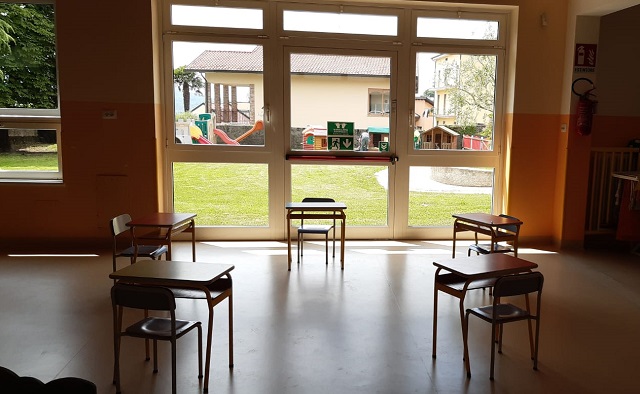 Nella speranza dell'arrivo definitivo della bella stagione, anche il grande giardino è stato diviso in modo che i vari gruppi composti da cinque bambini non si incontrino durante i giochi. Anche il momento del pranzo, così come il resto della giornata, avverrà in tutta sicurezza: è infatti presente una mensa interna che permetterà di cucinare i pasti in loco, e nel refettorio sono già stati sistemati cinque tavoli a distanza di sicurezza ed in cerchio, per permettere ai bambini di vedersi e chiacchierare e rendendo così l'ora di pranzo un momento educativo e di vicinanza simbolica.