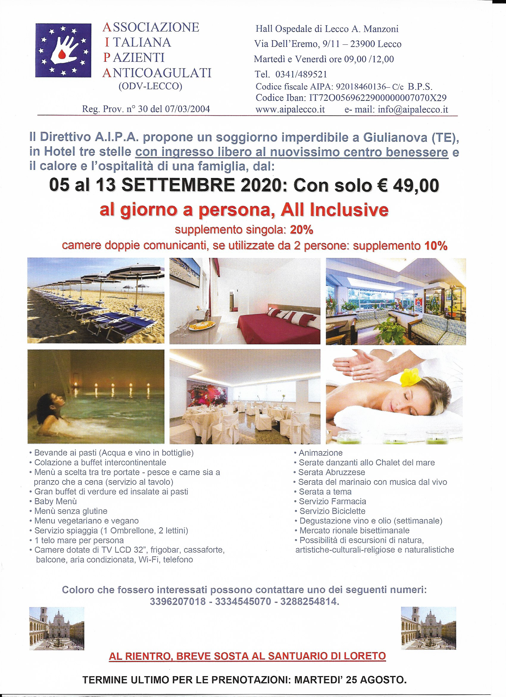 I soci di AIPA (Associazione Italiana Pazienti Anticoagulati) di Merate e Lecco propongono per il mese di settembre una vacanza a Giulianova, in provincia di Teramo, con soggiorno in un hotel tre stelle con ingresso libero al nuovo centro benessere. La gita è in calendario dal 5 al 13 settembre, e con 49€ al giorno si potrà usufruire di un servizio all inclusive. Nel prezzo - a cui verrà applicato un supplemento del 20% in cas di richiesta di camera singola - sono inclusi i seguenti servizi: bevande ai pasti (acqua e vino in bottiglie), colazione a buffet intercontinentale, pranzo che a cena (servizio al tavolo), gran buffet di verdure ed insalate ai pasti, baby menù, menù senza glutine, vegetariano e vegane, servizio spiaggia (1 ombrellone, 2 lettini), 1 telo mare per persona, camere dotate di TV LCD 32”, frigobar, cassaforte, balcone, aria condizionata, wifi e telefono, animazione, serate danzanti, serata abruzzese, serata con musica dal vivo, serata a tema, servizio farmacia, biciclette, degustazione vino e olio, mercato rionale bisettimanale, possibilità di fare escursioni.