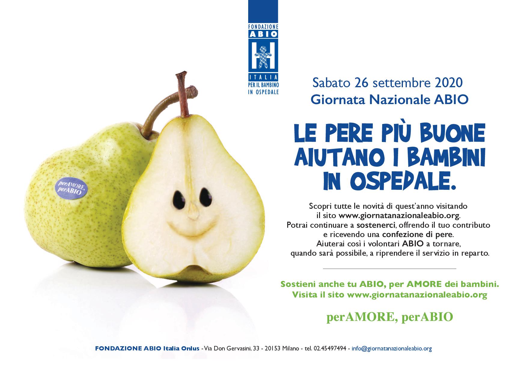 Da ormai più di 15 anni i volontari ABIO portano il loro sorriso e la loro testimonianza in oltre 150 piazze d’Italia per incontrare le moltissime persone che credono in quello che facciamo e sostengono la nostra attività. Quest’anno – vista l’emergenza sanitaria che il nostro paese sta vivendo – abbiamo deciso di trasformare la Giornata Nazionale ABIO in un grande evento online che darà la possibilità a coloro che in tutta Italia vogliono sostenere l’Associazione per il Bambino in Ospedale di ricevere direttamente a casa una confezione di pere a fronte di una donazione.