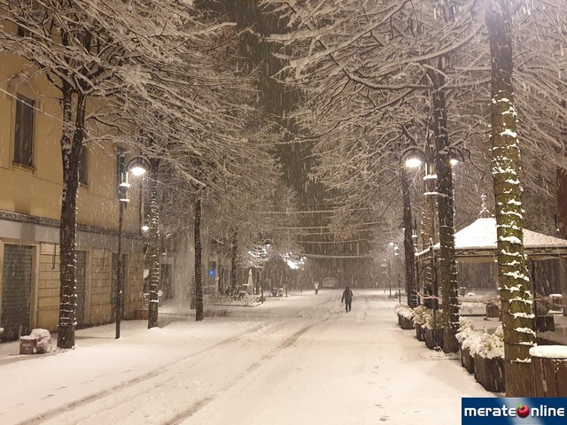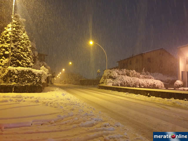 Alle 7 sulle strade di Merate, seppur a passo d'uomo, si procede. La circolazione non è particolarmente intensa. Le principali arterie (via De Gasperi, Via Verdi, via Cazzaniga, Via Turati) hanno già visto diversi passaggi dei mezzi spalaneve che hanno accumulato a lato strada. Le auto procedono lentamente con la neve che continua a cadere.