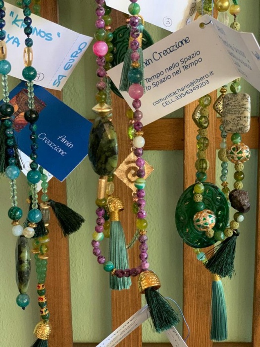 La comunità, oltre al contributo dei fratelli che lavorano e che destinano una parte dello stipendio a beneficio di tutti, si autosostiene con creazioni di artigianato realizzate a mano. Al pian terreno della casa, accanto allo spazio destinato alla preghiera, ci sono gli espositori con i manufatti. Collane legate alle antiche civiltà, dai colori sgargianti e dalle linee armoniose, ciondoli che richiamano gli angeli, oggetti da indossare che racchiudono in sé una bellezza interiore da assaporare e scoprire. La particolarità è rappresentata dalle magliette realizzate con foglie del giardino fatte macerare e da cui viene estratto il colore. Esemplari unici nel loro genere e che, assieme agli altri manufatti, rappresentano la parte visibile della comunità.