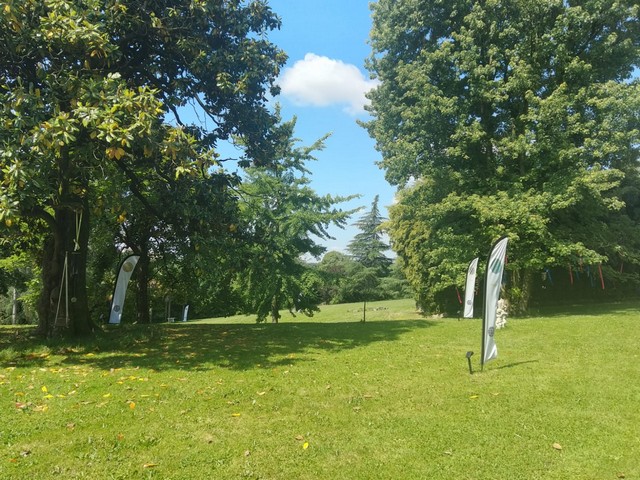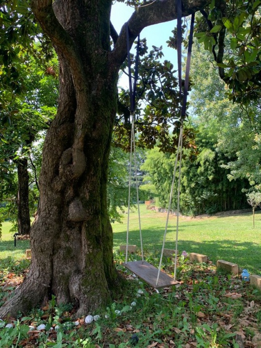 A dominare il parco è una magnolia bellissima, dalle foglie lucenti e con un tronco nodoso che potrebbe raccontare decenni di storia. Da un ramo penzolano due corde con un sedile in legno all'estremità: è un'altalena. Vuota. Questo è il punto sacro del giardino che richiama all'immagine della purezza, un ritorno alla fanciullezza e all'innocenza. Un simbolo per invitare a vivere la vita con gioia e a imparare a stare contemporaneamente nel divertimento e nella sacralità. Su una vela, campeggia la scritta: “Il tempo nello spazio e lo spazio nel tempo”.