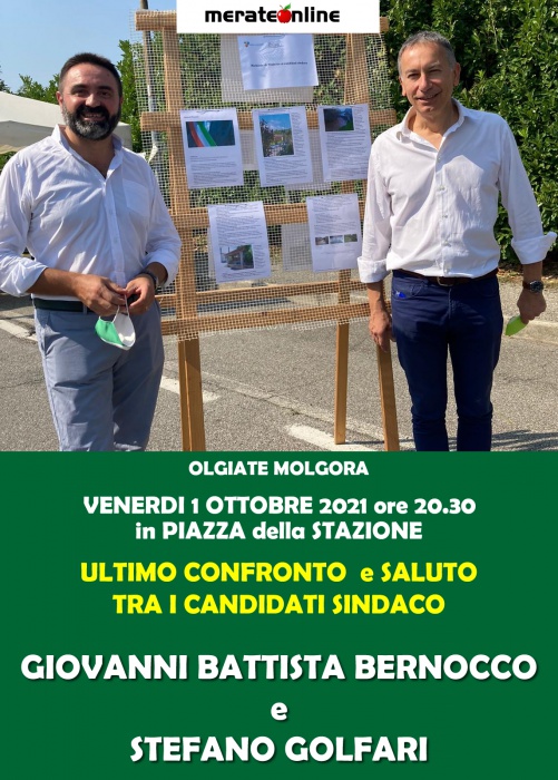 Le due compagini si ritroveranno in uno dei punti principali del paese e i candidati Giovanni Battista Bernocco per "Olgiate Rinasce" e Stefano Golfari per "Olgiate cambia passo" si saluteranno lanciando un ultimo appello agli elettori prima del silenzio imposto dalla normativa.