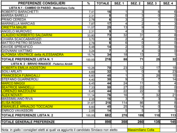 A parlare chiaro sono i dati: su un totale di 2149 votanti (58,46%) la lista di Airoldi ha raggiunto la fiducia di 1476 elettori, il 72%, confermandosi vincitore netto in tutti e quattro i seggi (due a Brivio, in Municipio, e 2 nella frazione di Beverate) contro i 574 voti dello sfidante Colla, fermo al 28%. Una vittoria schiacciante. Quindi un totale di 2149 voti con 34 schede bianche, 65 nulle e nessuna contestata.