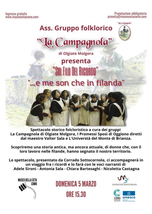 Il gruppo folkloristico “La Campagnola” di Olgiate Molgora si esibirà il prossimo 5 marzo presso il Museo della Seta a Como. Lo spettacolo storico-folcloristico che andrà in scena è intitolato “Sul filo del ricordo” e racconta la storia di donne che con il loro lavoro nelle filande, hanno segnato il territorio. L’evento è a cura dei gruppi La Campagnola di Olgiate Molgora e I Promessi Sposi di Oggiono, che saranno diretti dal maestro Valter Sala e l’Università del Monte di Brianza. L’ingresso è gratuito. L’appuntamento è fissato per le ore 15:30.