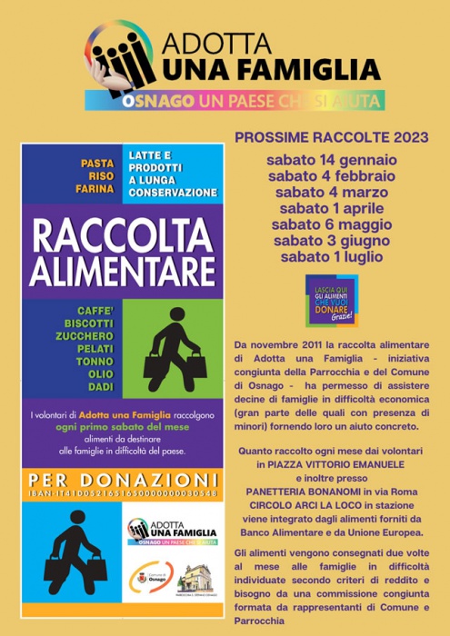 Sabato 4 marzo i volontari di Adotta una Famiglia saranno in piazza Vittorio Emanuele dalle 9 alle 19:30 per la raccolta alimentare mensile a favore delle famiglie osnaghesi in difficoltà, la prima del nuovo anno.