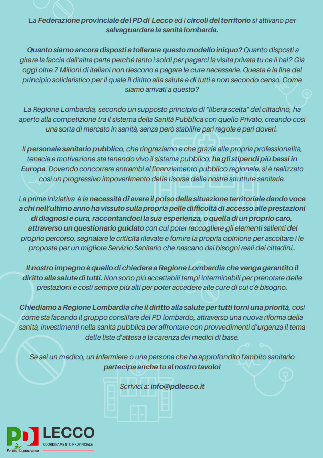Un coinvolgimento che passa anche attraverso il questionario guidato (https://forms.gle/1DNxdq7ByyFL3Noy7), attivato dal PD di Merate e che è stato poi sposato anche dal provinciale, dove si chiede ai cittadini di esporre le proprie esperienze con la sanità in provincia. Una raccolta dati fondamentale per avere il polso della situazione, che va al di là delle versioni ufficiali fornite dalle istituzioni.