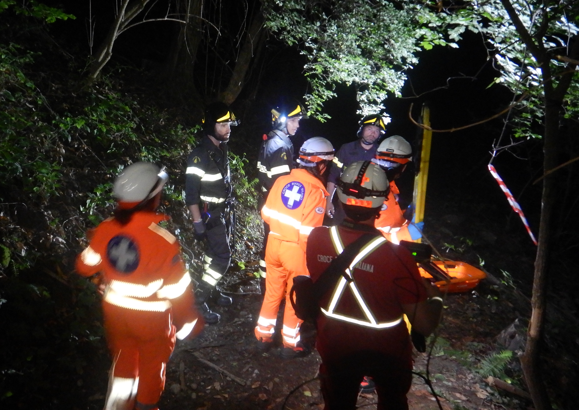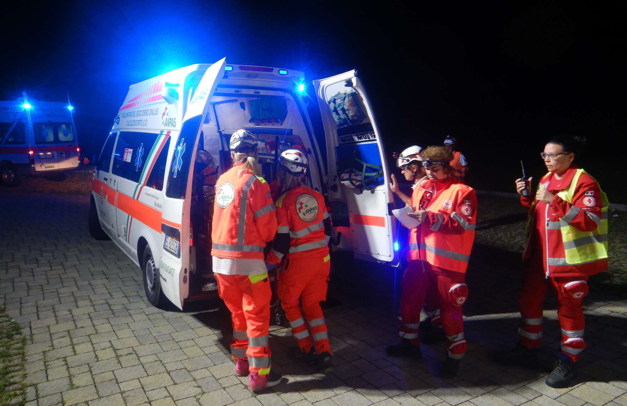 Poco prima dello scoccare della mezzanotte il coordinatore Mauro Sottocornola ha dichiarato lo stato d’allarme e i soccorritori si sono mobilitati prendendo posto a bordo dei propri mezzi, pronti per partire. La finta chiamata di emergenza è arrivata poco dopo: presso l’area boschiva di Bernaga c’è stata una frana, la strada è stata interrotta e non c’è possibilità di avanzare, però numerosi sono i dispersi nel bosco. La sede operativa mobile, coordinata da Alessio Rosa, ha iniziato a mandare mezzi sul luogo del crash. Giunti in via per Lissolo, i soccorritori hanno lasciato le ambulanze e si sono addentrati nei sentieri per recuperare i feriti, interpretati da simulanti certificati che ore prima sono stati truccati e si sono disposti nel bosco.