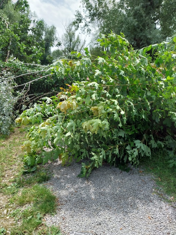 Ma la furia del vento non ha risparmiato anche altre piante che sorgono attorno alle sponde. Poco più avanti, sempre partendo dalla foce sul sentiero a ovest dello specchio d’acqua, in direzione della casetta di osservazione, altri rami sono finiti nel lago e un’altra pianta ora è pericolosamente piegata con la chioma nell’acqua è il fusto inclinato a circa 20° sulla superficie del bacino.