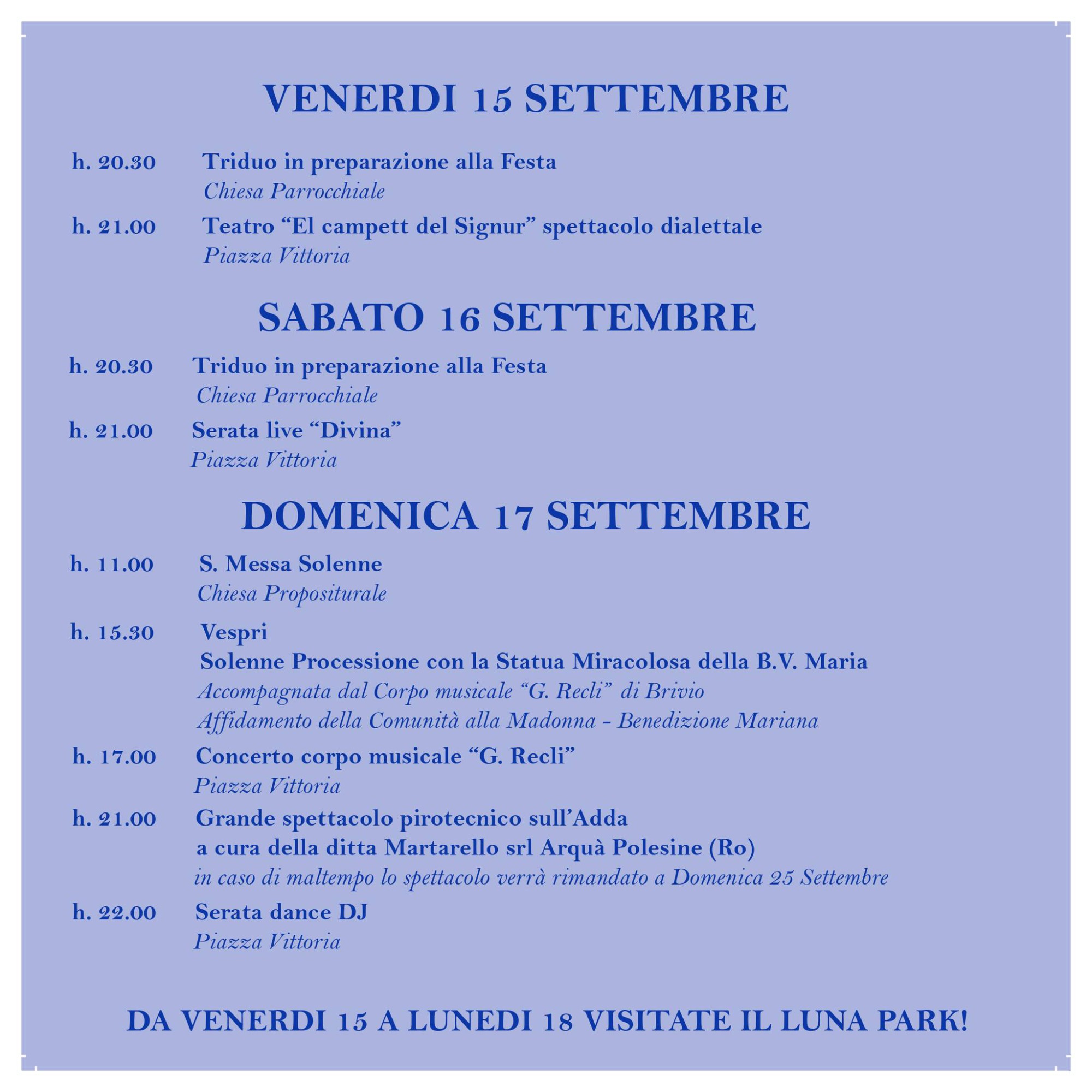Infine, domenica 17 settembre, il vero e proprio giorno di festa di aprirà con la messa solenne delle ore 11. Alle 15:30 si terrà la Solenne processione con la statua miracolosa della Beata Vergine Maria accompagnata dal Corpo musicale “G.Recli” di Brivio, che alle 17 terrà un concerto presso piazza della Vittoria. Alle 21 invece si terrà lo spettacolo pirotecnico sull’Adda e l serata proseguirà con un dj set.