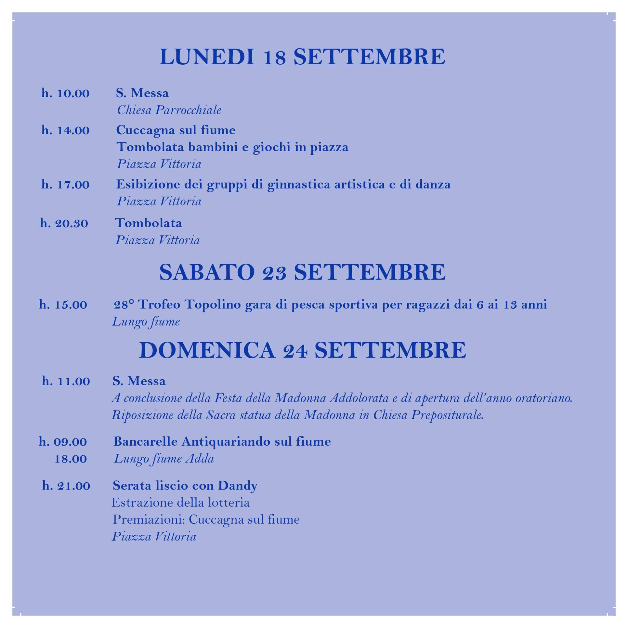 Lunedì 18 settembre verrà celebrata la messa alle ore 10, mentre alle 14 verrà proposta la cuccagna sul fiume e tombolata per bambini e giochi in piazza. Alle 17 in piazza della Vittoria si terrà l’esibizione dei gruppi di ginnastica artistica e di danza. Alla sera, tombolata.