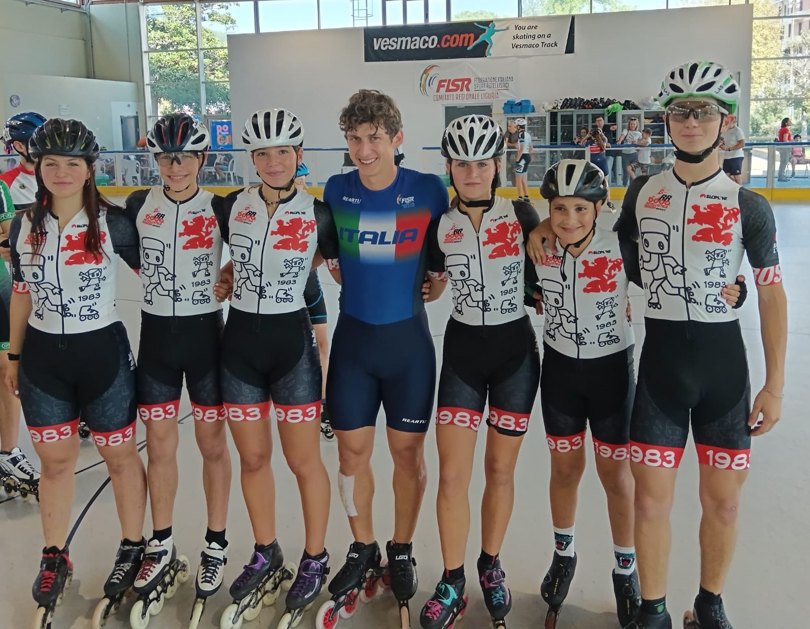 Divisi su due impianti , da una parte le due giovani categorie, nel secondo i grandi mattinata dedicata, come primo riconoscimento all’impegno degli atleti in questa lunga stagione 2023 ad un intenso stage tecnico e coordinati da alcuni dei loro Allenatori, questa volta non divisi a bordo circuito per dirigere ed incitare i loro atleti, ma uniti a centro pista per insegnare a tutti i loro atleti qualcosa di nuovo, soprattutto come comportamenti di gara in situazioni molto ravvicinate e complesse. Grande sorpresa e gioia di tutti, l’arrivo in pista dell’ospite d’onore Duccio Marsili, campione del mondo che pattini ai piedi , ha allenato ed incitato gli atleti, ovviamente emozionatissimi di correre fianco con il loro beniamino.