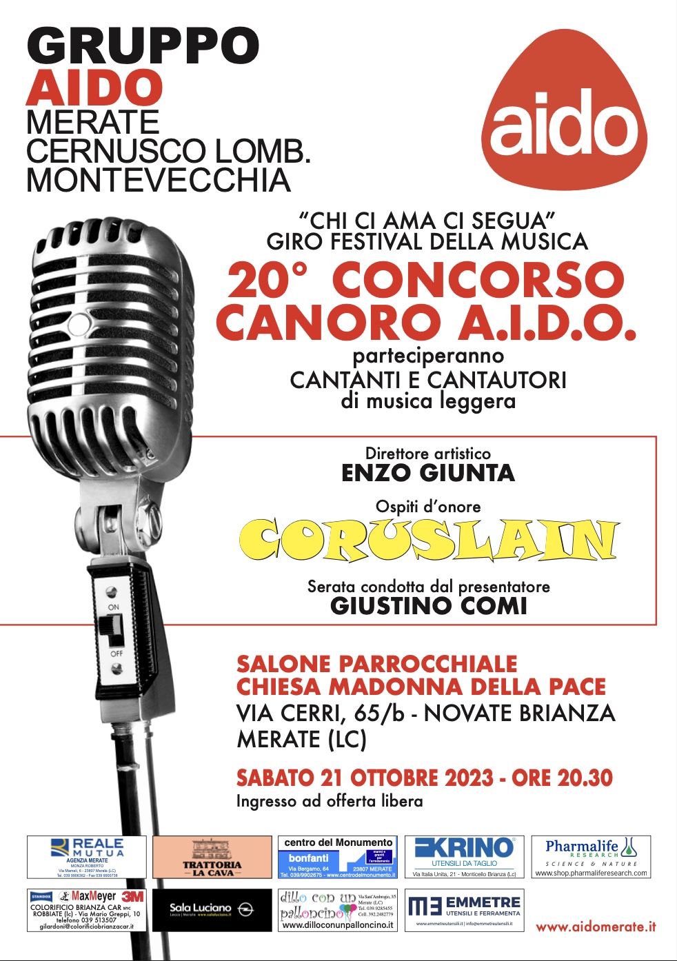 SABATO 21 OTTOBRE 2023 alle ore 20.30 presso il Salone Parrocchiale sotto la Chiesa Madonna della Pace - Via Cerri, 65/B - Novate di Merate si terrà il 20° Concorso Canoro CANTAIDO.