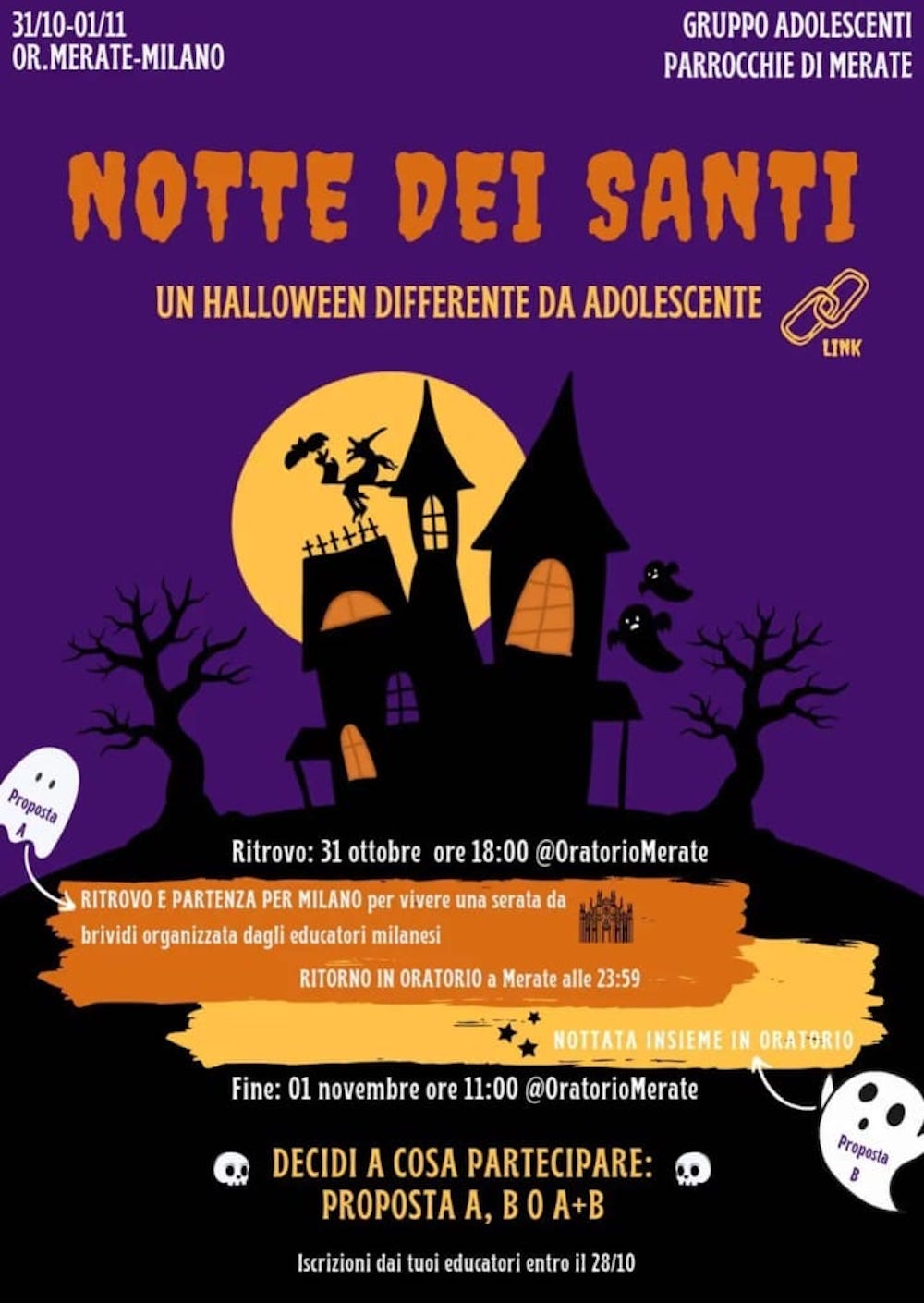 A Merate il Csa e la Pro Loco hanno organizzato una grande festa che inizierà martedì 31 ottobre alle 17 con la sfilata in centro al paese, a seguire, alle 18:30, aperitivo “da paura” presso il Centro Anziani e per finire, alle 19:30, cena “mostruosa”. Parallelamente, il gruppo di adolescenti e le parrocchie del paese hanno organizzato un’uscita a Milano per vivere una serata da brividi organizzata dagli educatori milanesi. La partenza è prevista alle ore 18 dall’oratorio di Merate. In alternativa è possibile fermarsi in oratorio e trascorrere la nottata lì, fino alle 11 del giorno successivo.