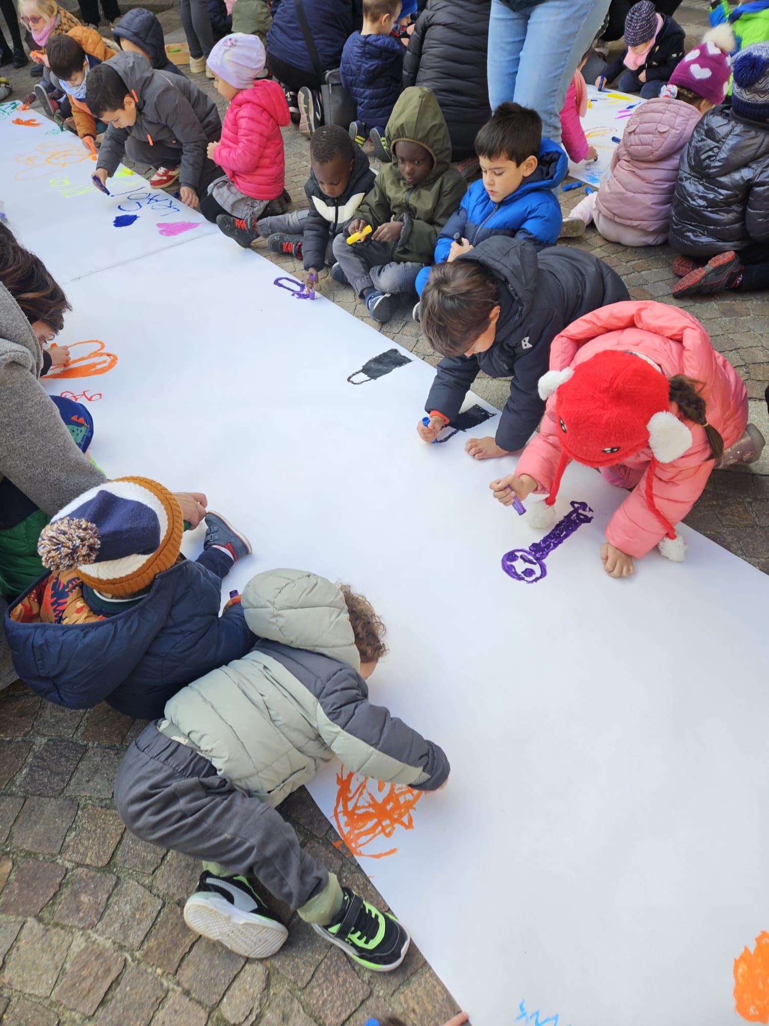 Lungo tutta la piazza Vittoria hanno disegnato fogli bianchi per riempirli di colori, per dimostrare a tutti di quanta bellezza possono riempire il mondo.