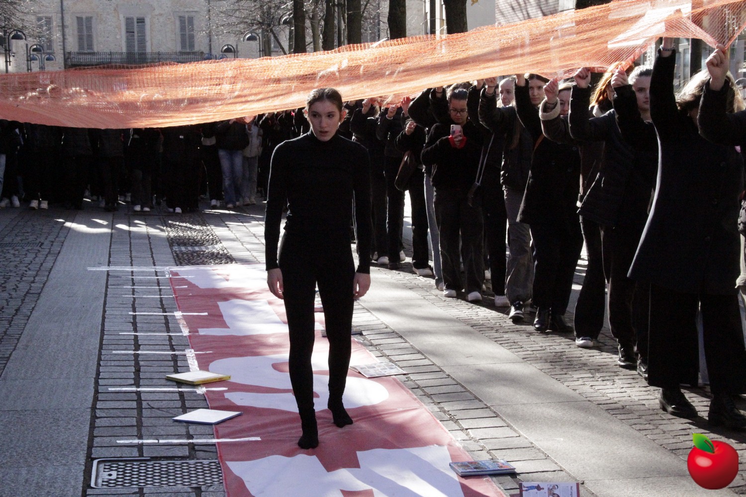 Qui una giovane ballerina, imprigionata in una rete arancione, ha reso plastico il senso di soffocamento, angoscia, costrizione che vivono le donne vittime di violenza.