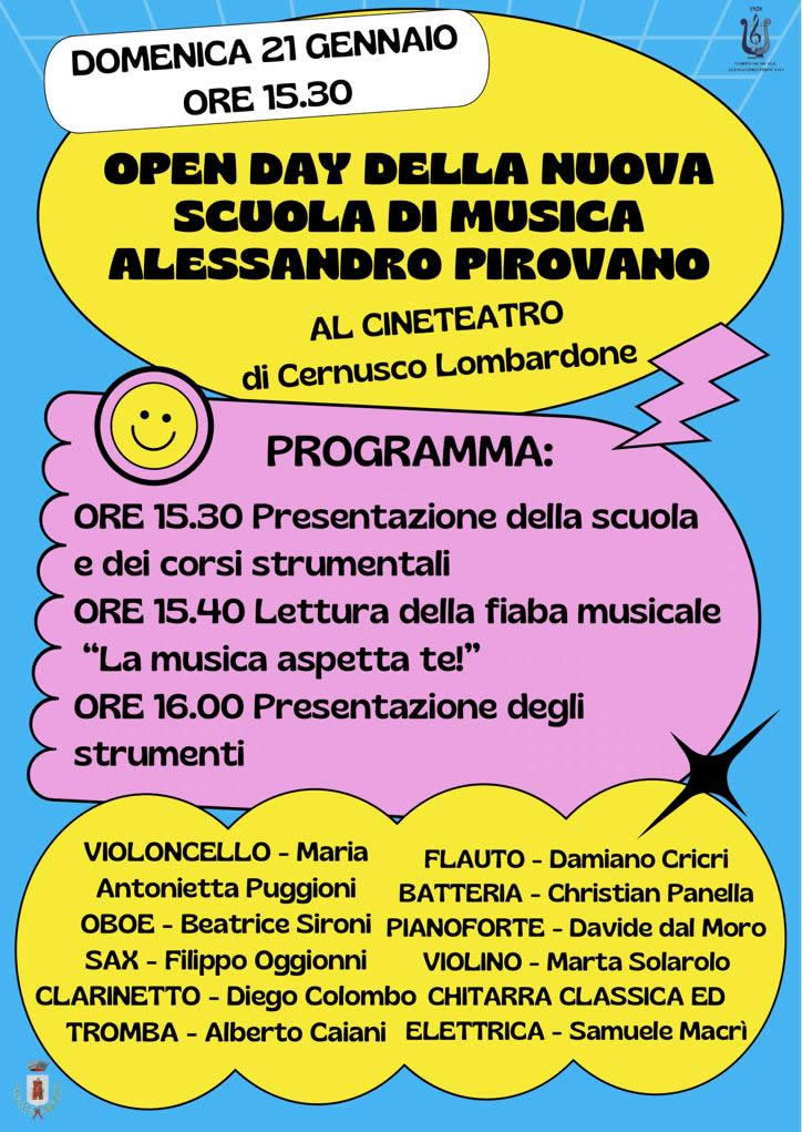 L’open day si terrà al cineteatro San Luigi di Cernusco Lombardone, dove saranno presenti gli insegnanti dei corsi che si esibiranno anche insieme. I docenti, prevalentemente giovani, diplomati o diplomandi, sono coordinati dal Maestro Damiano Cricrì. La banda cernuschese si è affidata allo storico direttore della scuola di musica “Don Borghi” di Calco. La dirige da quasi 30 anni. A Cernusco porterà quel metodo sperimentato e applicato con successo alla scuola di Calco che vanta una settantina di iscritti.