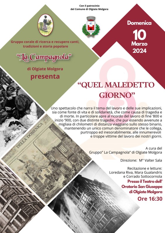 Giunti al parcheggio della chiesa, i partecipanti sono invitati nel teatro dell'oratorio per assistere a “Quel maledetto giorno”, spettacolo a cura de' La Campagnola che narra il tema del lavoro e delle sue implicazioni, sia come fonte di vita e di solidarietà, che come causa di tragedia e di morte.