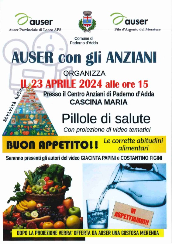 Martedì 23 aprile alle 15.00 si terrà, presso Cascina Maria a Paderno, il quarto incontro della rassegna "Pillole di Salute" organizzata da Auser. Titolo di questo appuntamento “Buon Appetito”. Sarà dunque un’occasione per parlare delle corrette abitudini alimentari con Giacinta Papini e Costantino Figini. Al termine della proiezione dei video tematici verrà offerta una gustosa merenda.