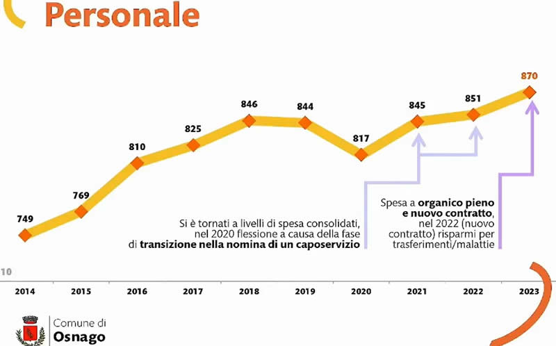 Gli indicatori sul personale, il cui costo è aumentato per il nuovo contratto di servizio, hanno consentito al sindaco uscente di dimostrare riconoscenza nei confronti dei dipendenti. “La spesa sul personale è di natura corrente, ma la considero un investimento. Abbiamo un organico forte che ha saputo affrontare momenti di difficoltà con i trasferimenti, i pensionamenti e le assenze, senza che ne risentisse la qualità dei servizi. La spesa sul personale è stata ampiamente e lautamente ripagata da tutti i bandi che abbiamo vinto e che ci hanno permesso di sostenere molti costi”. Una slide proiettata ha espresso il senso di queste parole. Nell’ultimo quinquennio il Comune di Osnago ha saputo intercettare 38 bandi per un valore complessivo di 3,6 milioni di euro. Il Comune ha aggiunto dalle proprie casse poco più di 1 milione, realizzando così opere per quasi 4,7 milioni di euro. Investimenti che sono stati perciò possibili senza contrarre nuovi mutui, riducendo il tasso di indebitamento al 3,56% nel 2023 rispetto alla spesa corrente (il limite è il 10%).