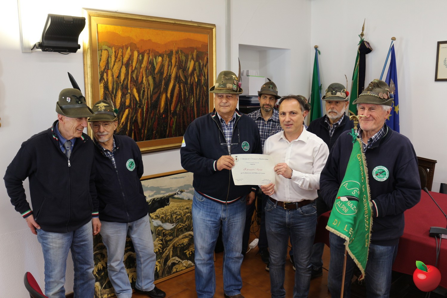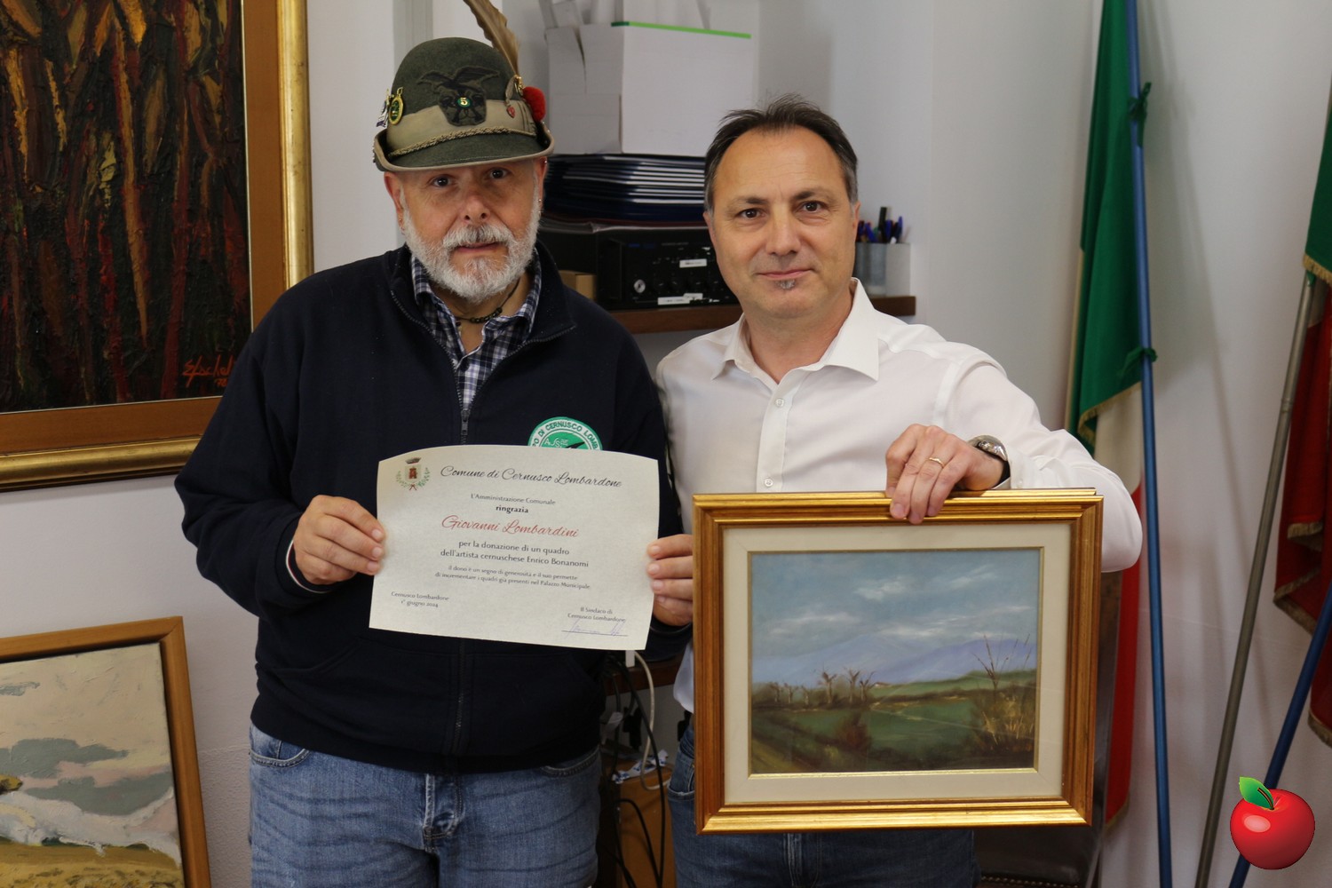 La cerimonia è stata preceduta sempre nella stessa mattina da un altro impegno relativo ad "Arte in Comune", ovvero la consegna da parte del sindaco Gennaro Toto di alcuni attestati in segno di ringraziamento a quattro cittadini che, per amore dell'arte e della comunità, hanno deciso di donare alcune opere d'arte proprio alla sede municipale. "Il dono è un segno di generosità e il suo permette di incremetare i quadri già presenti nel Palazzo Municipale" recitano le pergamene. Paola Caputo, che ha donato il quadro "Spaventapasseri" dell'artista meratese Massimo Bollani, e Giovanni Lombardini, il quale ha invece regalato un quadro dell'artista cernuschese Enrico Bonanomi, hanno ricevuto subito il ringraziamento dell'Amministrazione. Dolores Previtali, scultrice autodidatta originaria di Bergamo e residente a Robbiate che ha donato un carboncino realizzato e Carlo Porro, fotografo professionista titolare di Puntofoto a Merate che ha donato una foto di Cernusco Lombardone che scattò per una collezione incentrata sullo stop alla violenza sulle donne, non hanno potuto presenziare ma verranno al più presto ringraziati allo stesso modo con la consegna delle pergamene.
