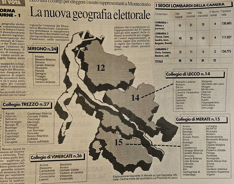 Nel frattempo con la riforma del 21 dicembre 1993 sono stati modificati i collegi elettorali. Nel lecchese, che ancora non faceva provincia, sono stati disegnati il collegio per la Camera nr. 14 (Lecco) e il nr. 15 (Merate). In quest’ultimo collegio il PPI schiera Domenico Galbiati, Dc di lungo corso; la Lega Lombarda in alleanza con Forza Italia punta sul montevecchino Alberto Bosisio.