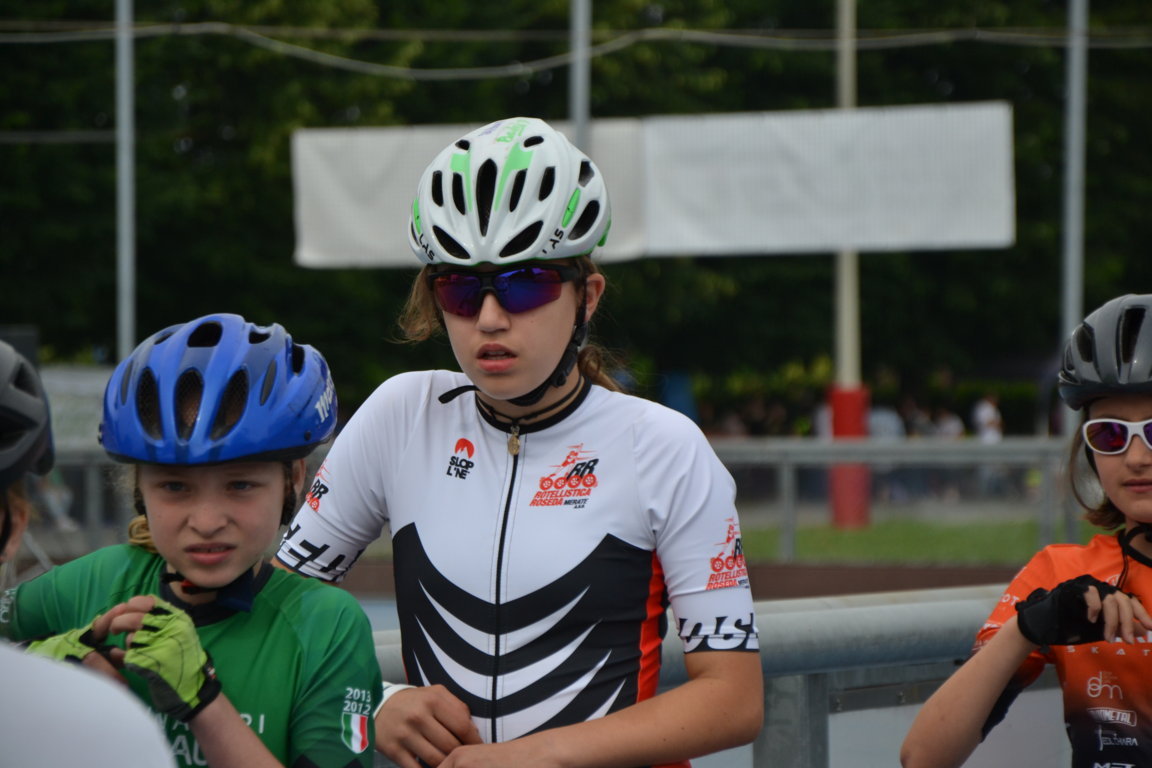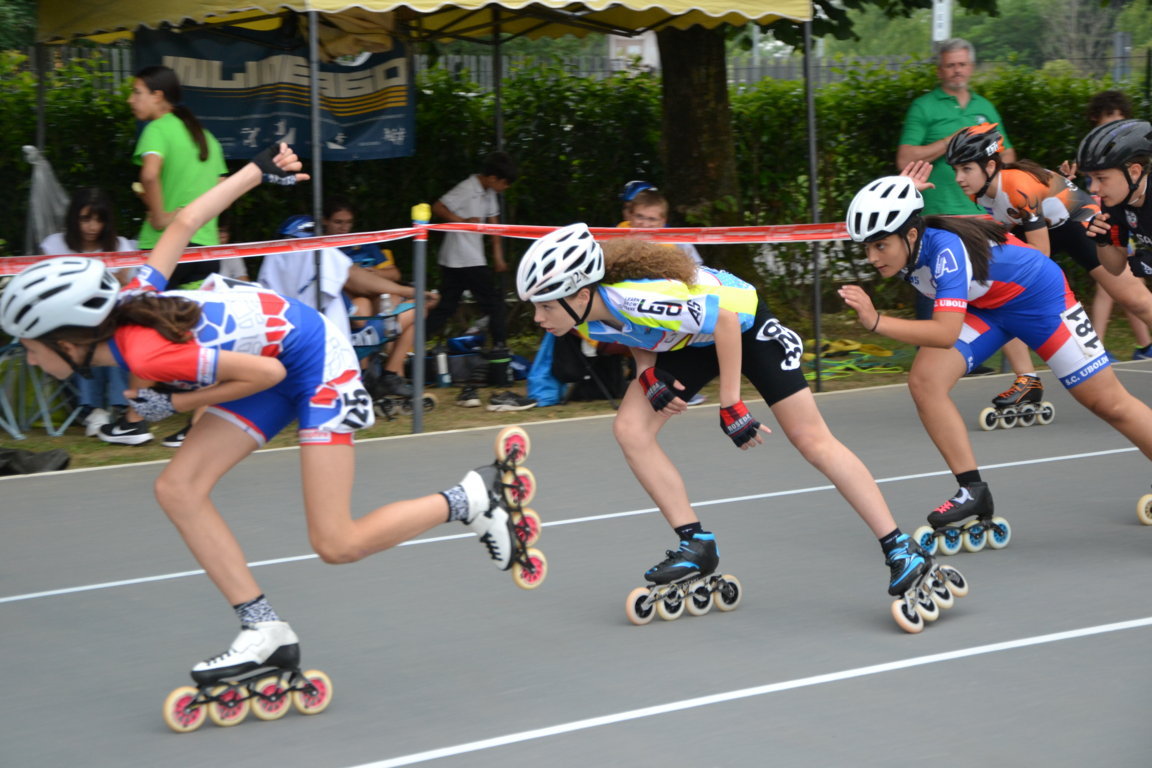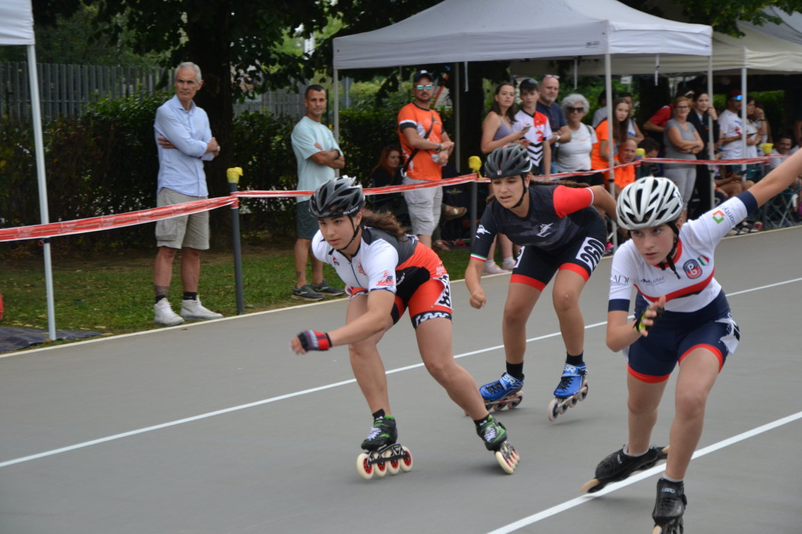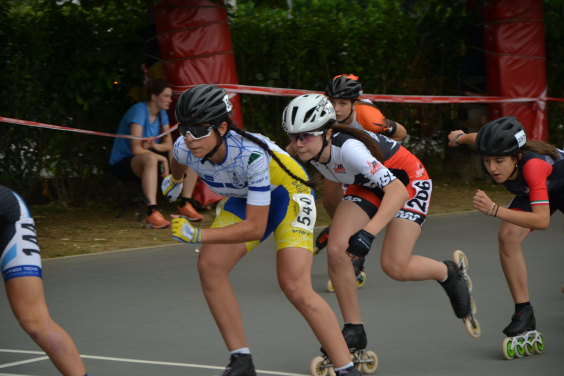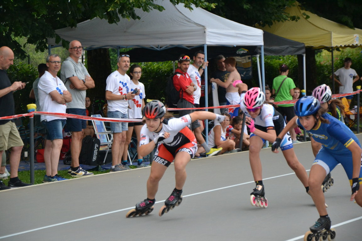 Podi, pausa e si riprende nel primo pomeriggio con previsioni Meteo confuse che obbligano a Giuria a cambiare e poi ancora a ricambiare l’ordine delle gare. Alla fine si decide di cominciare per tutte le categorie con le gare lunghe. Una leggera pioggia iniziale da nuvole per fortuna solo di passaggio obbligherà le atlete convocate in categoria Ragazze della seconda batteria per la 3000m a puntiad un rapido cambio di ruote, così è il pattinaggio corsa. Qui le rosedine sono tante: superano le batterie in tre per andare a concludere le finali prima della fine della giornata Giada Fenu che concluderà brava 11 a, Gloria Ripamonti correrà con la maglia del Canguro ottenuta la settimana prima per la 22a posizione, Sofia Lorello invece 23a. Le compagne Emma Guntri, Gaia Varisco, Sara Aldeni e Arianna Marasco nella seconda parte della classifica.