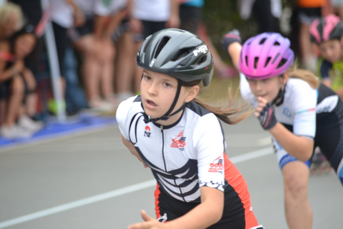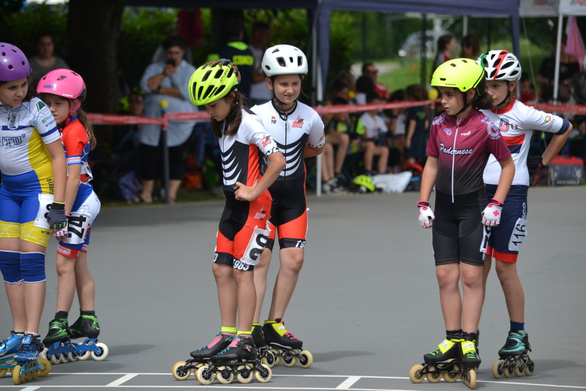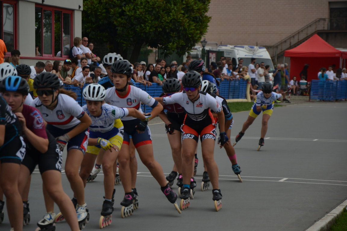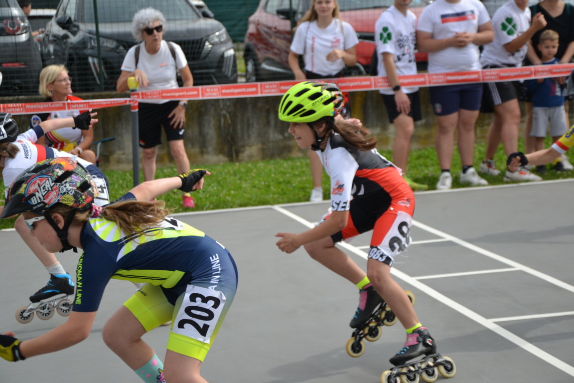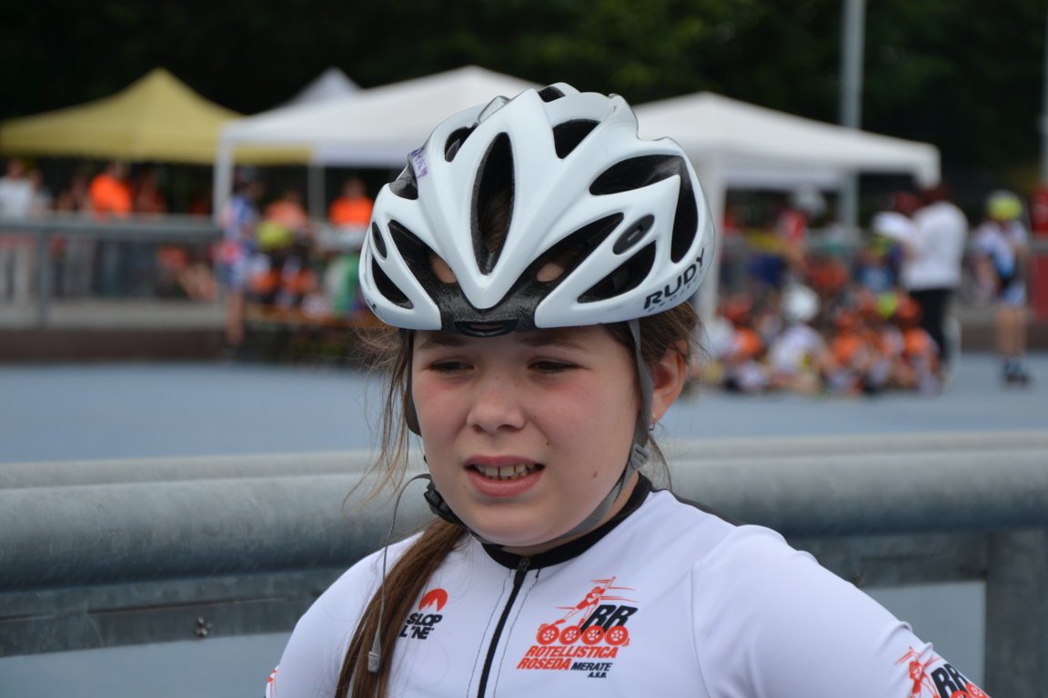 Podi, pausa e si riprende nel primo pomeriggio con previsioni Meteo confuse che obbligano a Giuria a cambiare e poi ancora a ricambiare l’ordine delle gare. Alla fine si decide di cominciare per tutte le categorie con le gare lunghe. Una leggera pioggia iniziale da nuvole per fortuna solo di passaggio obbligherà le atlete convocate in categoria Ragazze della seconda batteria per la 3000m a puntiad un rapido cambio di ruote, così è il pattinaggio corsa. Qui le rosedine sono tante: superano le batterie in tre per andare a concludere le finali prima della fine della giornata Giada Fenu che concluderà brava 11 a, Gloria Ripamonti correrà con la maglia del Canguro ottenuta la settimana prima per la 22a posizione, Sofia Lorello invece 23a. Le compagne Emma Guntri, Gaia Varisco, Sara Aldeni e Arianna Marasco nella seconda parte della classifica.