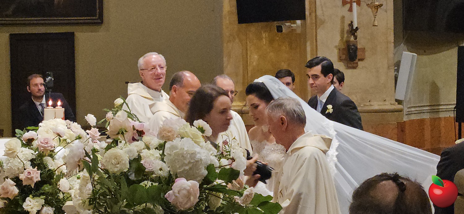 Lo sposo con parenti e amici è rimasto sino a pochi minuti dopo le 16 sul sagrato, quando ha fatto il suo ingresso lungo la navata principale adorna di enormi cesti di fiori bianchi, sino sull'altare.