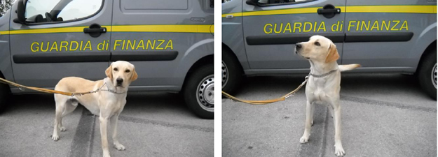 I “cash-dogs” delle Fiamme Gialle sono in prevalenza cani di razza labrador, particolarmente docili e dotati di un grande olfatto. Fin da cuccioli sono abituati a riconoscere l’odore delle banconote, anche a distanza, nascoste nei doppifondi dei veicoli, dei bagagli ovvero occultate nei modi più stravaganti. Un addestramento lungo e complesso durante il quale i cani, giocando, hanno imparato a fiutare il denaro.