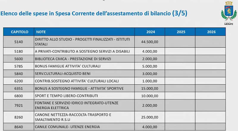 Tra le spese correnti si evidenziano i 140 mila euro di IMU erroneamente versati da importanti realtà commerciali, dunque da restituire. Ci sono anche i 44.500 euro per anticipare al Comprensivo scolastico i fondi per le progettualità in modo che possano partire fin da settembre e non ad autunno inoltrato. Molte voci sono destinate a Retesalute per rispondere ad esigenze conclamate. Ce ne sono 2 mila in più per l’attività di counselling con una psicopedagogista che quest’anno è stata affidata proprio all’azienda speciale meratese. Il servizio partirà a settembre, come ha specificato la vice sindaca Valeria Marinari.