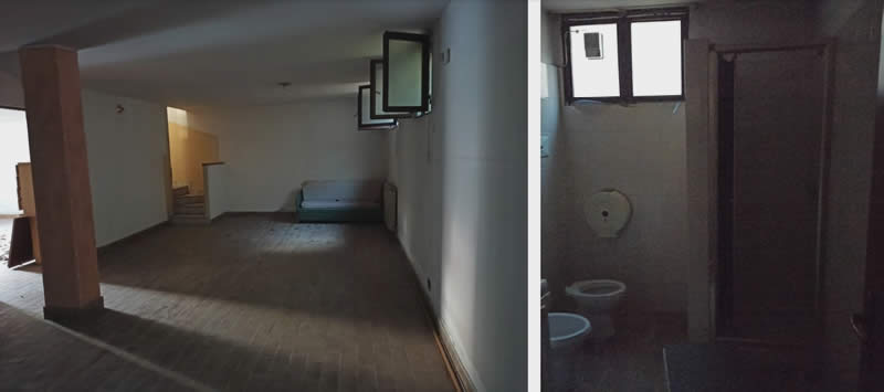Intanto per la prima volta mostriamo le condizioni attuali degli spazi interni del bene confiscato, con la piantina di come saranno riorganizzati. Al momento dalla porta di ingresso a piano terra si accede al soggiorno. L’androne ribassato mette in comunicazione tre camere da letto e un bagno. L’altro servizio igienico era ad uso esclusivo della stanza matrimoniale. Da quella che era la cucina, in fondo, si può uscire nel portico, con vista sul giardino e sulla piscina interrata costruita senza autorizzazione dagli ex proprietari. Il seminterrato è composto da un garage di 36,38 mq raggiungibile dal cancellone con una rampa, da un ampio vano di circa 50 mq catalogato come deposito, da una cantina di 13,33 mq e da un locale caldaia di 4,29 mq.