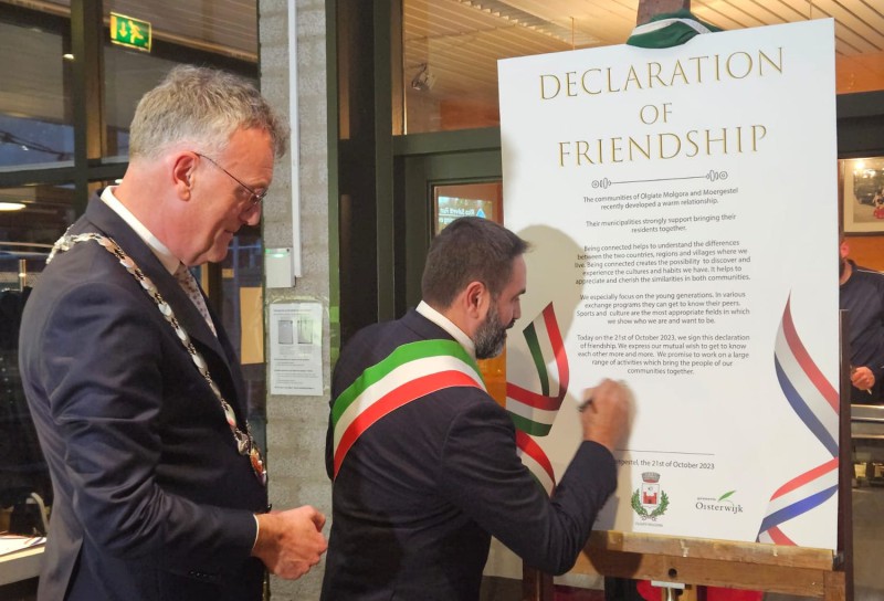 La firma del gemellaggio nel 2023 con il sindaco di Olgiate Giovanni Battista Bernocco e il sindaco di Oisterwijk Hans Janssen