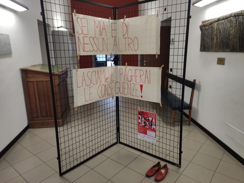 L'esposizione, insieme ad una sedia e ad un paio di scarpette rosse, rimarrà in comune per tutta la settimana, per mantenere forte l'attenzione della cittadinanza su una problematica che colpisce e affligge tutta la società.
