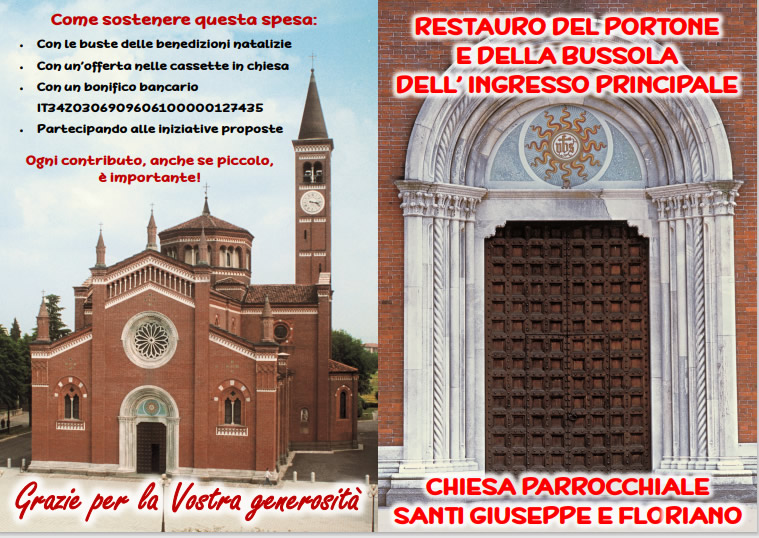 La parrocchia dei santi Giuseppe e Floriano di Verderio ha attivato una raccolta fondi per poter finanziare il restauro del portone e della bussola della chiesa parrocchiale. Si tratta di un intervento ormai indifferibile e il cui costo stimato ammonta a 18mila euro.