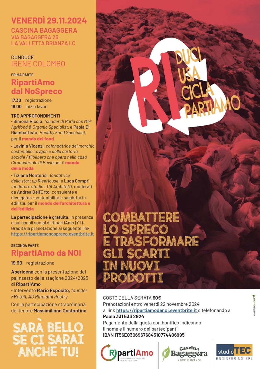 L’associazione RipartiAmo, nata nel 2021 per dare concretezza a un progetto ideato durante la pandemia nel marzo 2020, organizza un importante evento dedicato alla sostenibilità e al riciclo, dal titolo “RipartiAmo dal No Spreco”. L'incontro si terrà il 29 novembre a Cascina Bagaggera, a La Valletta Brianza, luogo simbolo di inclusione e rispetto per l’ambiente, situato nel cuore del Parco Regionale del Curone.