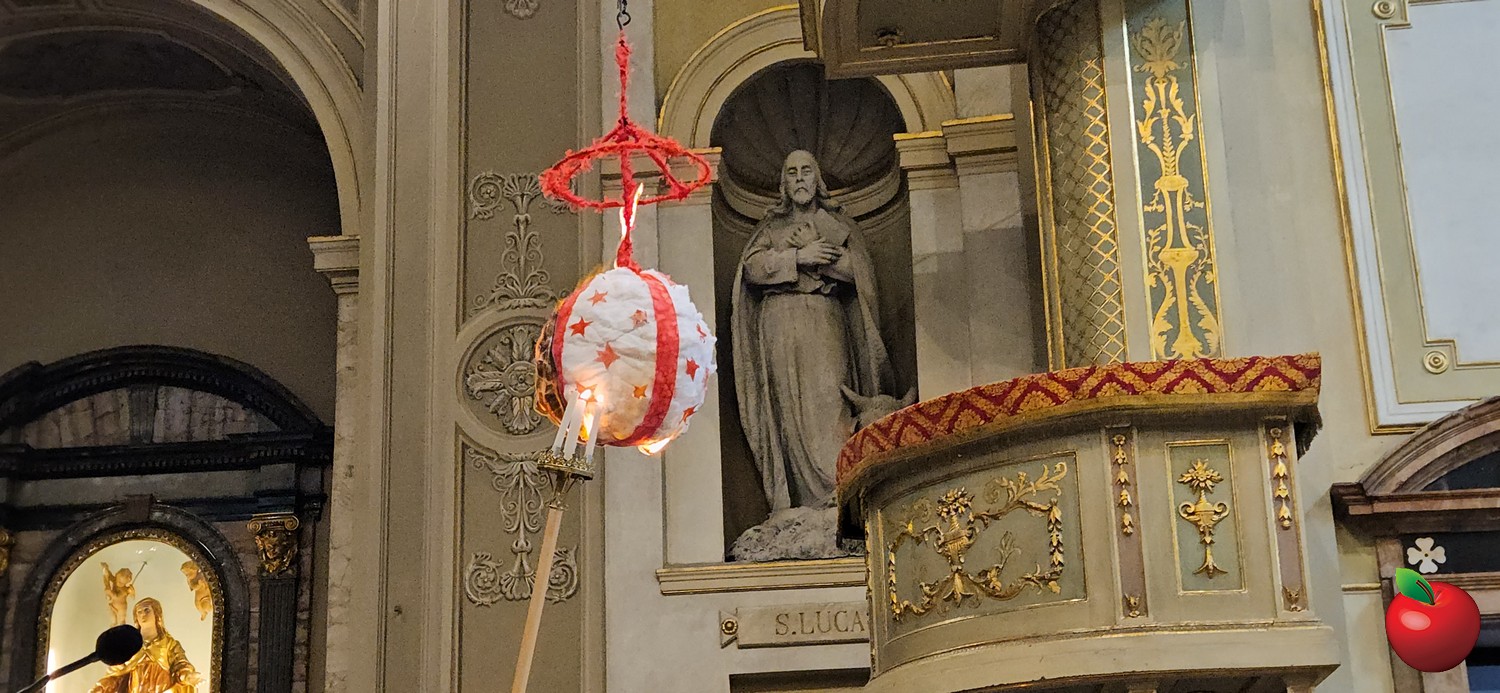 La funzione si è aperta con il pallone di cotone, realizzato da un gruppo di amiche per fare compagnia a una ragazza malata, bruciato sopra l'altare. Un rito che si ripete e che tiene con gli occhi incollati verso l'alto l'intera navata affolata di fedeli.