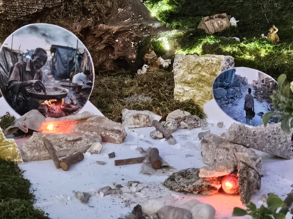 A Montevecchia sulla sommità delle tende nel deserto dove si svolgono alcune scene del presepe campeggia una bandiera, a memoria delle nazioni in guerra: dalla vicinissima Ucraina sino a raggiungere Isrraele e e Palestina.