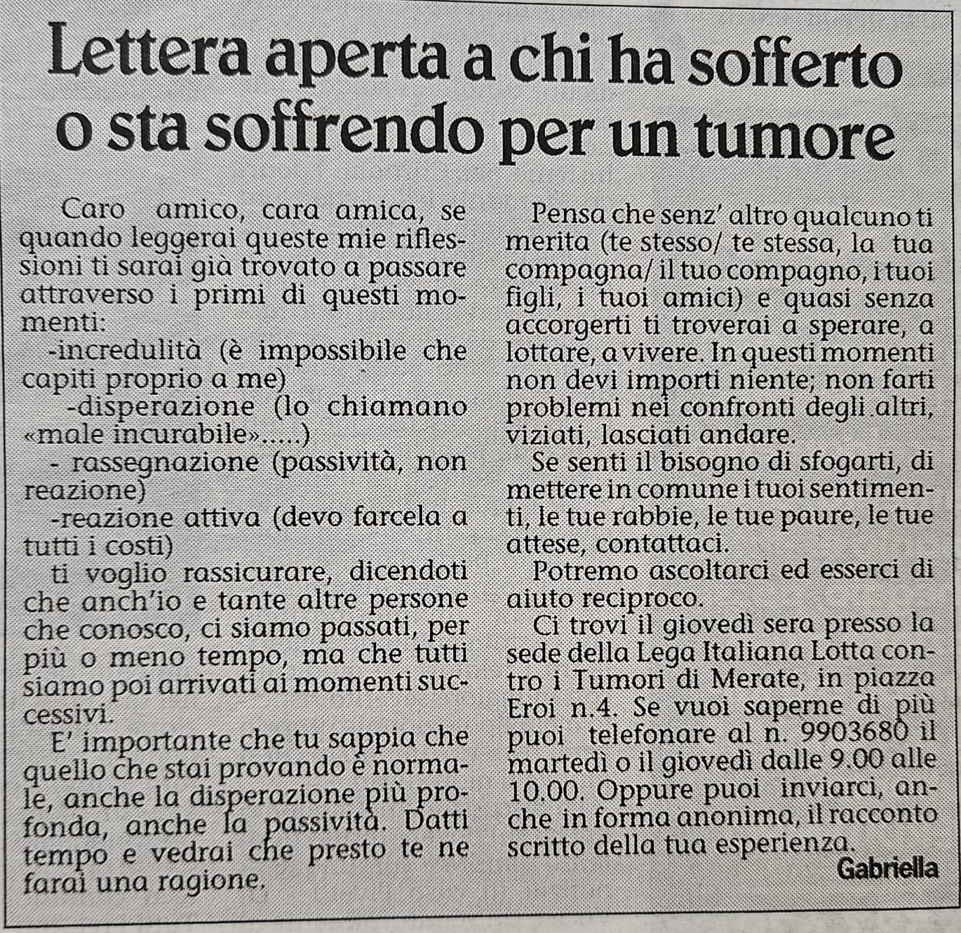 Il 13 settembre 2024 si è spenta all’Hospice di Airuno la dottoressa Gabriella Maggioni. Combatteva contro un tumore da trent’anni. Ci piace qui ricordare una bella pagina che la Gazzetta di Merate diretta da Ernesto Galigani (che domenica 16 ottobre si era unito in matrimonio con Daniela Martini) aveva dedicato all’associazione “Vivi” fondata da persone affette da questa malattia.