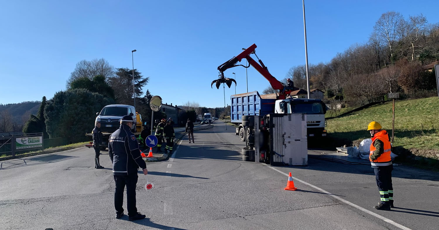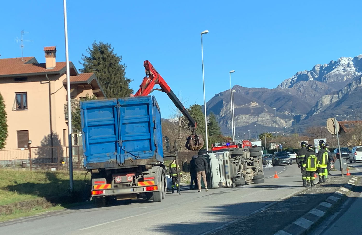Il furgone è rimasto così schiacciato sul lato passeggero, impedendo il transito di veicoli e ostruendo la carreggiata con il materiale caduto dal cassone. Sul posto sono giunti gli agenti della polizia locale con il comandante Alberto Maggioni e una squadra dei vigili del fuoco.