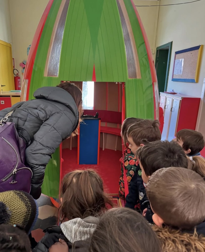Da inizio anno infatti la scuola aveva accordi con alcuni falegnami che stavano realizzando un vero e proprio razzo in legno da far atterrare a scuola. E così è stato. La consegna è avvenuta lunedì, quando nella struttura non c’era nessuno. Appena scesi dal pulmino al rientro dal planetario, i bambini se lo sono ritrovati davanti.