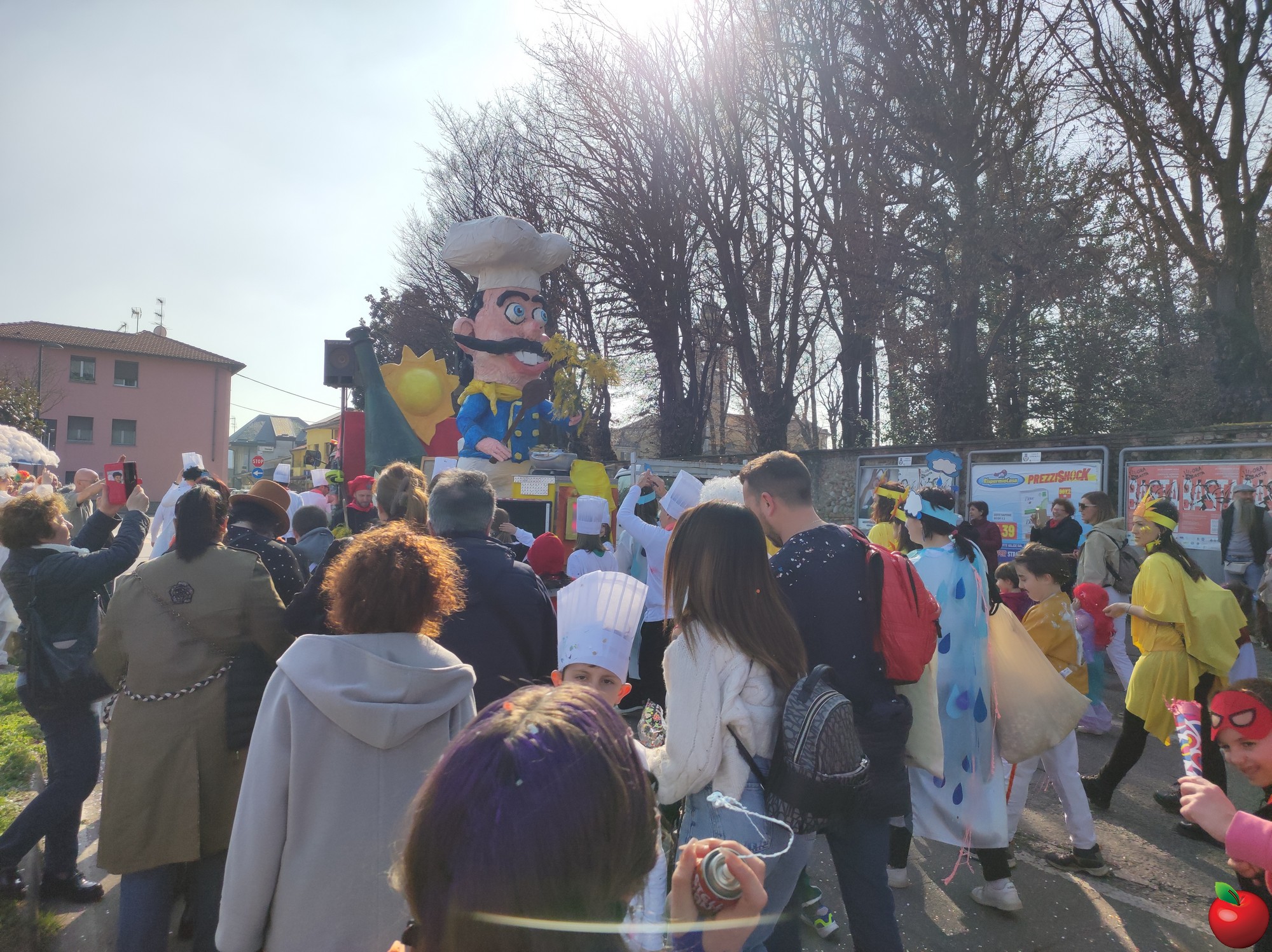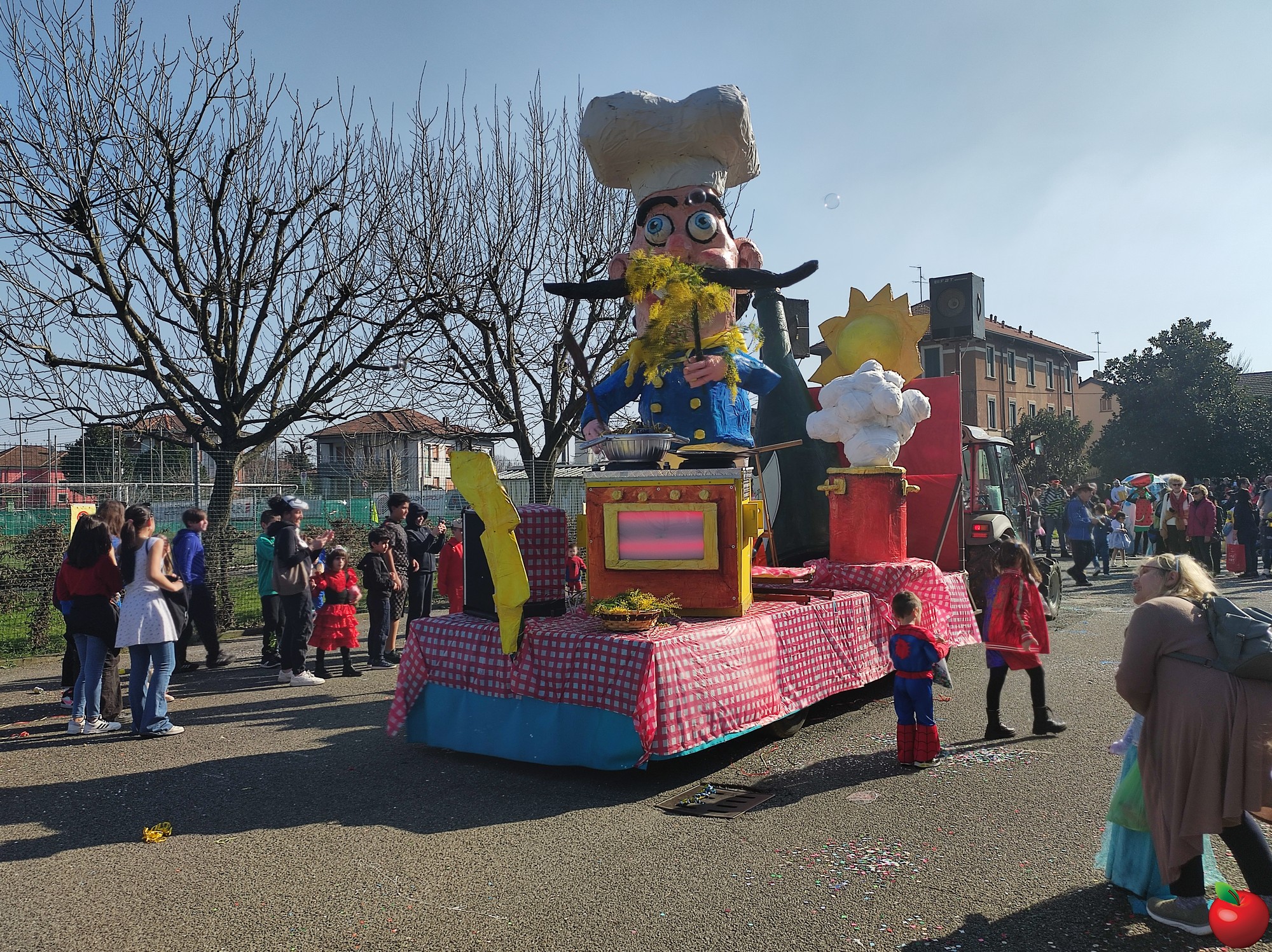 Tanti cittadini grandi e piccini si sono riuniti al centro sportivo per attendere l’arrivo del carro realizzato dai papà dell’oratorio a tema “Il meteo in cucina”. Un grande chef ha proposto il menù dei colori dell'iniziativa “Replay” proposta dalla Fondazione Oratori Milanesi, il tutto accompagnato da un buon “Don Pérignon” “prodotto” da don Andrea. Per rendere omaggio alla festa della Donna, il carro è stato decorato da tanti rametti di mimosa.