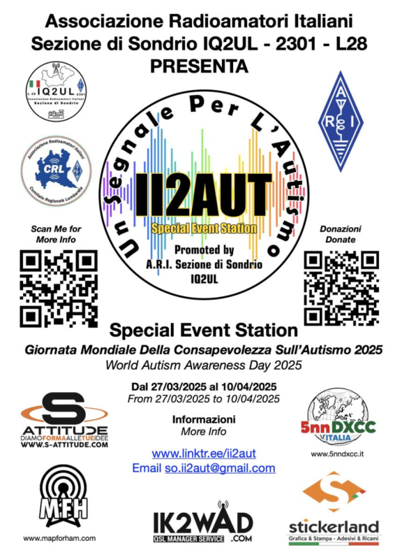 I radioamatori della Sez. ARI Sondrio hanno dato vita al progetto II2AUT per unire il loro mondo e l’Autismo, e permettere a persone diversamente abili di comunicare attraverso l’SSB, o CW o altri modi digitali in grado di offrire dare un'alternativa alle normali cure che le persone Autistiche hanno bisogno. Dal 27 marzo al 10 aprile II2AUT sarà ON AIR per trasmettere questo messaggio di solidarietà per le persone Autistiche in occasione della Giornata Mondiale della Consapevolezza sull'Autismo 2025.