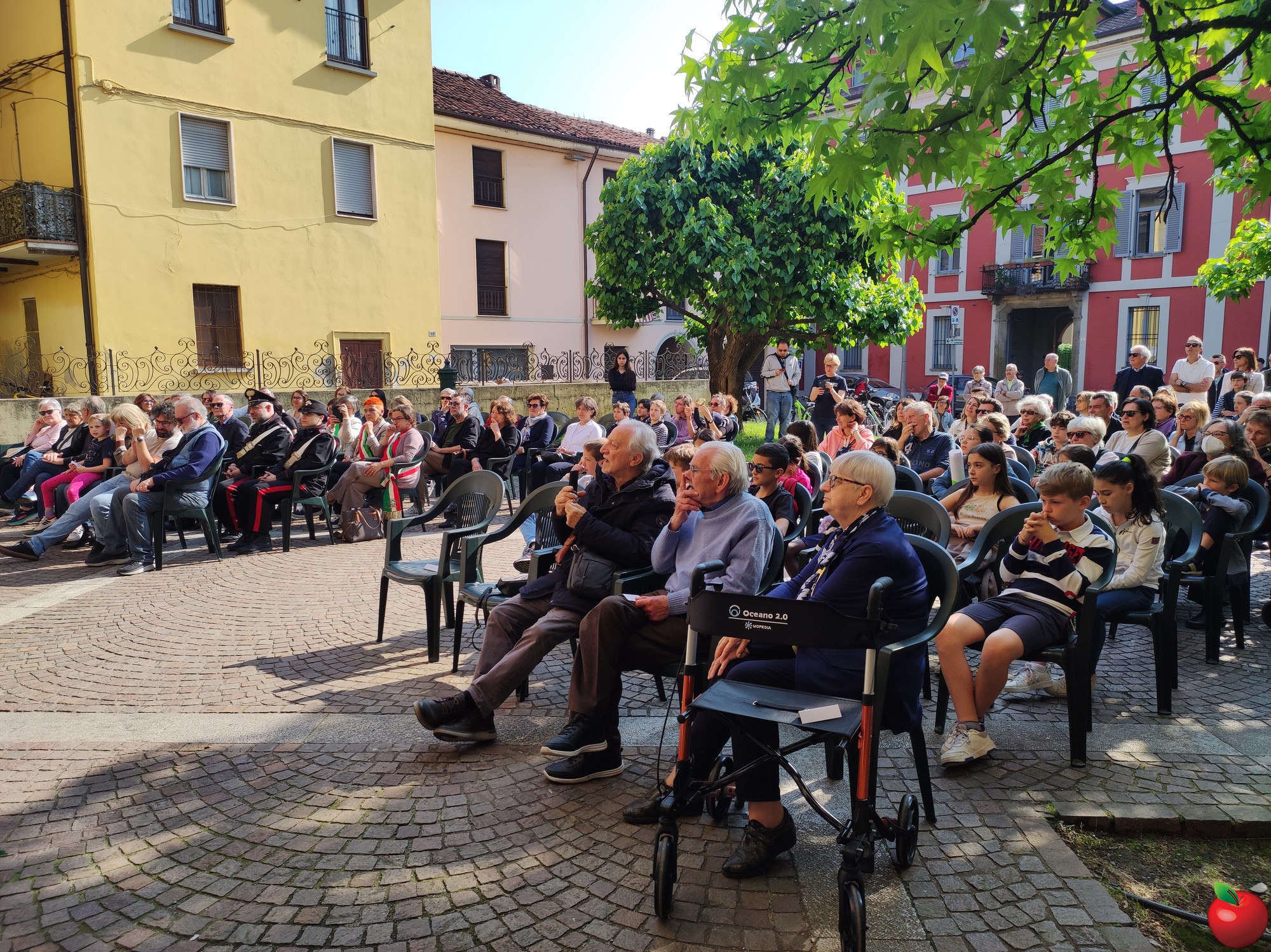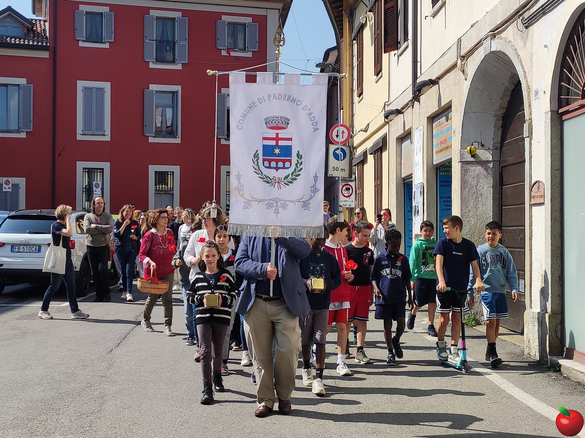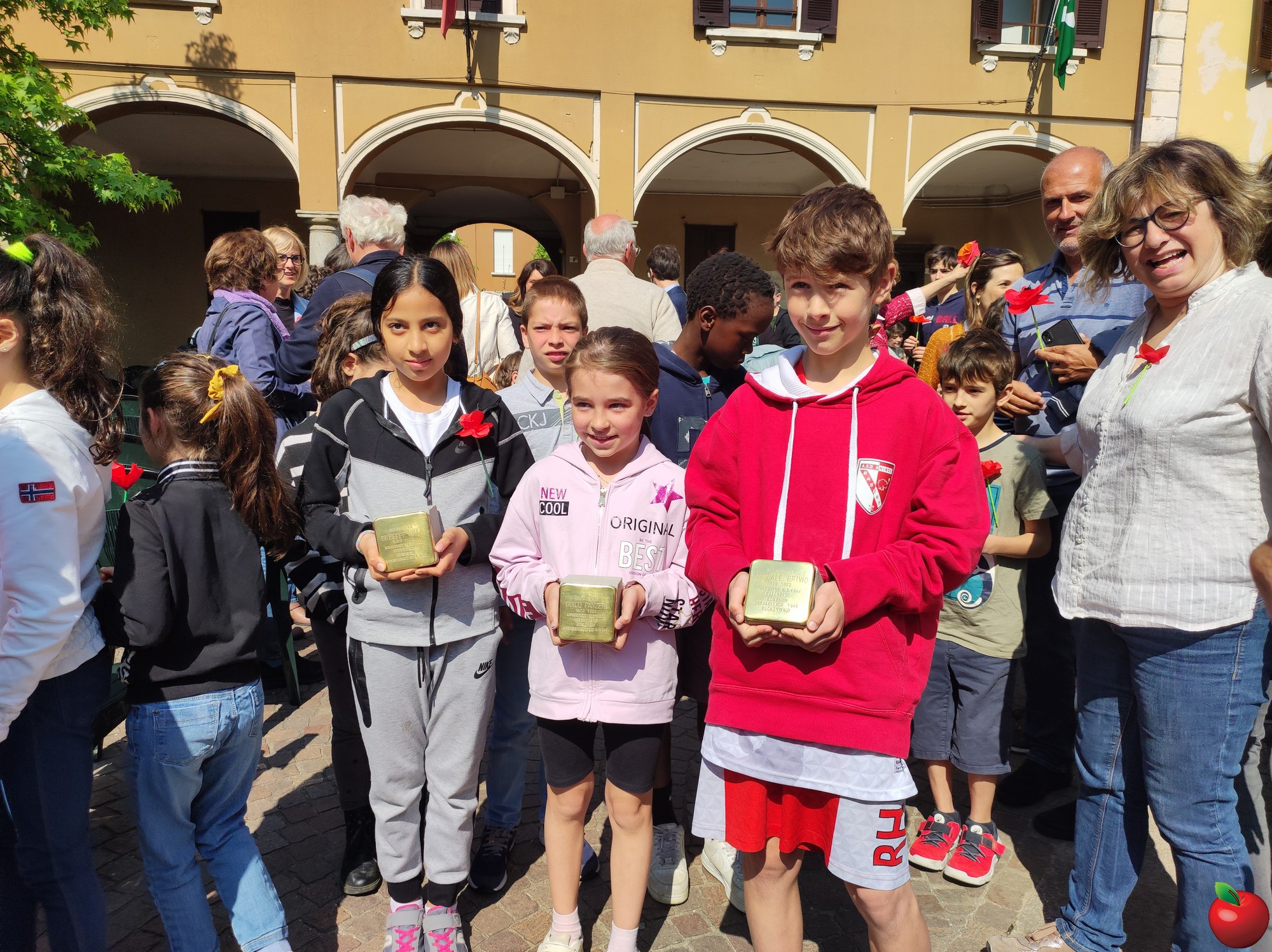 Al termine degli interventi, gli alunni della 4A, 4B, 5A e 5B della primaria del paese hanno mostrato il loro lavoro: un cartellone che riporta la loro visione delle Pietre d'Inciampo, un dono al paese per arricchire ancora di più il ricordo dei tre “eroi”. I bambini hanno dunque distribuito a tutti i presenti un papavero in ricordo dei Partigiani, prima di raccogliersi dietro al labaro del Comune e dirigersi verso la Corte Grande.