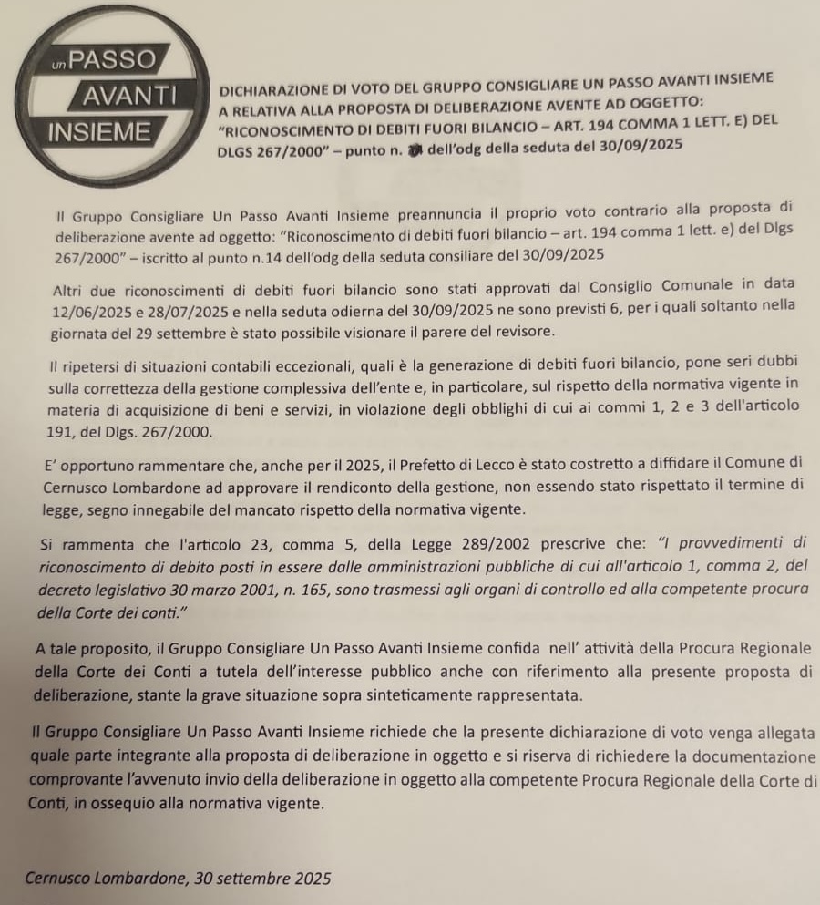 I consiglieri di UPAI hanno votato contrariamente al riconoscimento di tutti e sei i debiti, presentando la medesima dichiarazione di voto per ogni punto: “ Il ripetersi di situazioni contabili eccezionali, quali è la generazione di debiti fuori bilancio, pone seri dubbi sulla correttezza della gestione complessiva dell'ente e, in particolare, sul rispetto della normativa vigente in materia di acquisizione di beni e servizi” ha detto Brusadelli, rammentando la diffida del Prefetto al Comune ad approvare il rendiconto della gestione, non essendo stato rispettato il termine di legge: “segno innegabile del mancato rispetto della normativa”. (CLICCA QUI per leggere il testo integralmente). A rispondere è stato il capogruppo di maggioranza, Gerardo Biella, con una dichiarazione di voto favorevole: “Nonostante le molte ‘cassandre’ anonime e le critiche, lecite, della minoranza consiliare, le finanze del nostro Comune godono di buona salute. È vero, qualche difficoltà c’è stata e la situazione ha provocato qualche fibrillazione, anche interna al gruppo, ma la differenza tra chi governa e chi fa opposizione sta proprio nell’affrontare i problemi e poi saperli risolvere” ha detto, offrendo poi una riflessione per mirare a vedere quanto accaduto come il risultato di un’operazione di controllo e trasparenza. (CLICCA QUI per visualizzare il testo integrale).