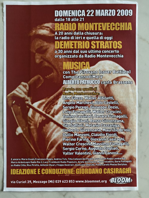 Tra le voci indimenticabili quelle di Angelo Marchesi, che si occupava di libri, di Gianni Canova (già rettore allo Iulm) che parlava di cinema; e poi Sergio Perego – compianto giornalista che ha collaborato anche con le nostre testate – che la domenica mattina disquisiva di erboristeria con Lino Fiocco. Quest'ultimo di lì a poco avrebbe assunto la presidenza della radio: un trampolino di lancio se si considera che negli anni Novanta è stato responsabile logistica per Barley Arts. C'era poi Aldo Castelli, grande appassionato di musica che non a caso a seguire prese le redini del Bloom di Mezzago e che a Radio Montevecchia proponeva i suoi brani preferiti, dal jazz a Terry Riley.