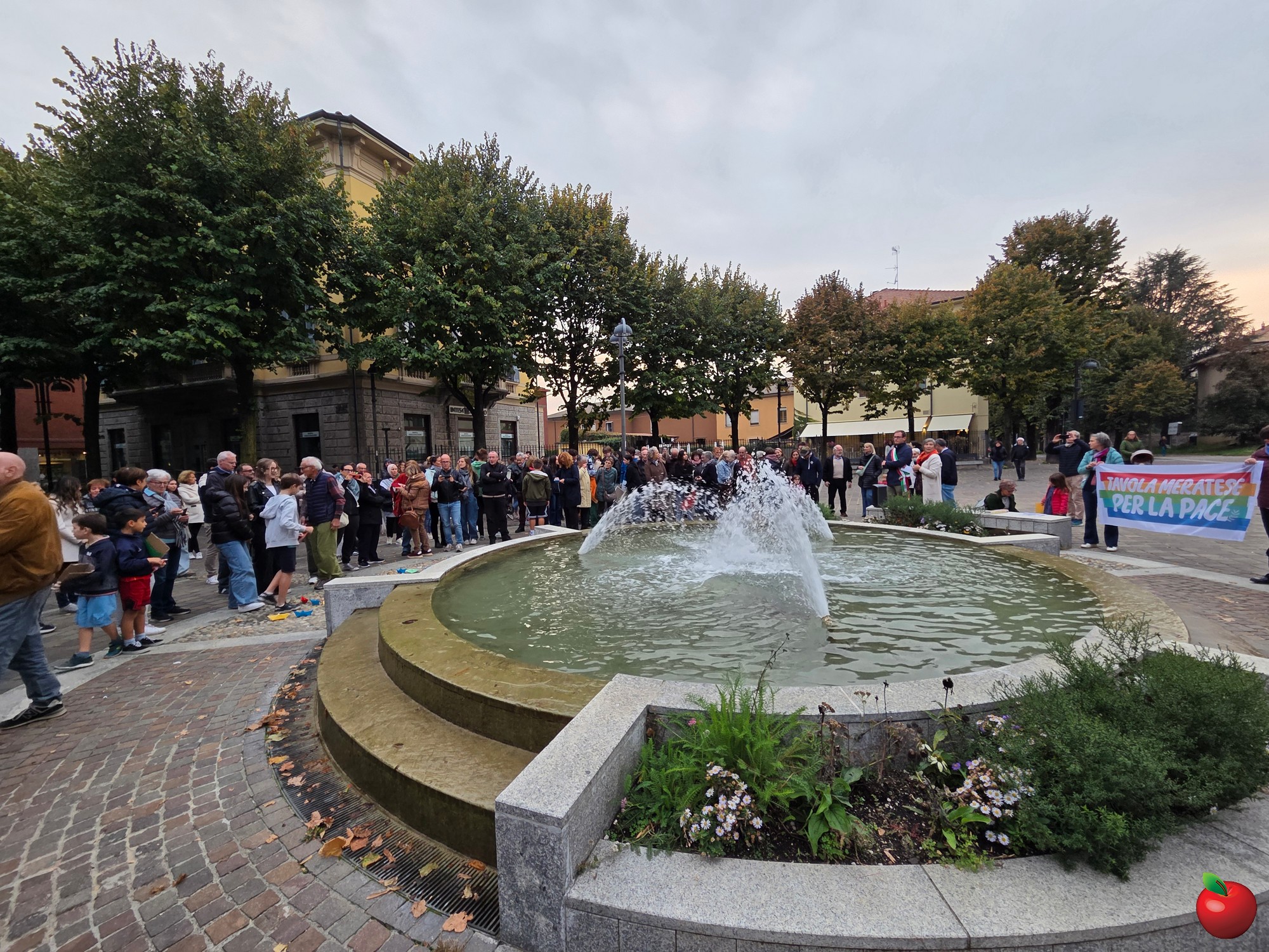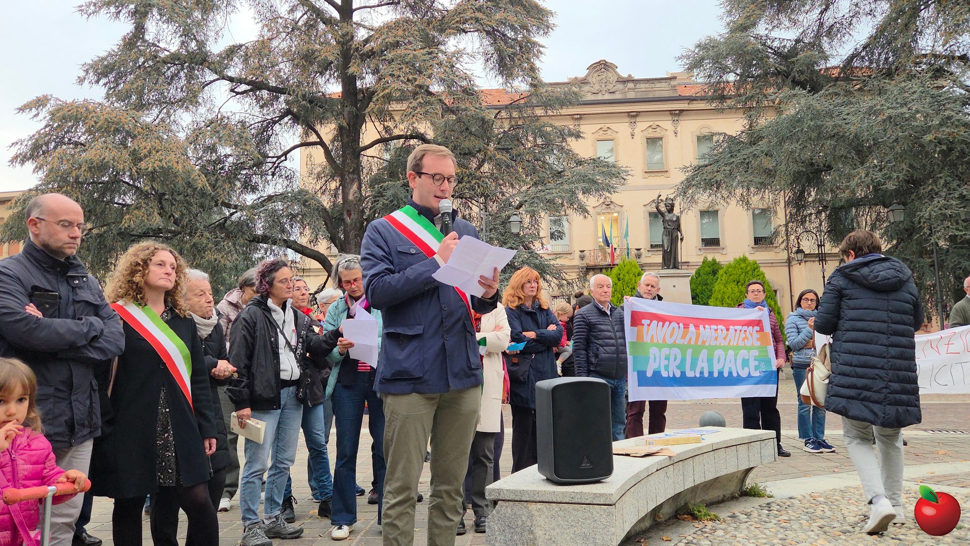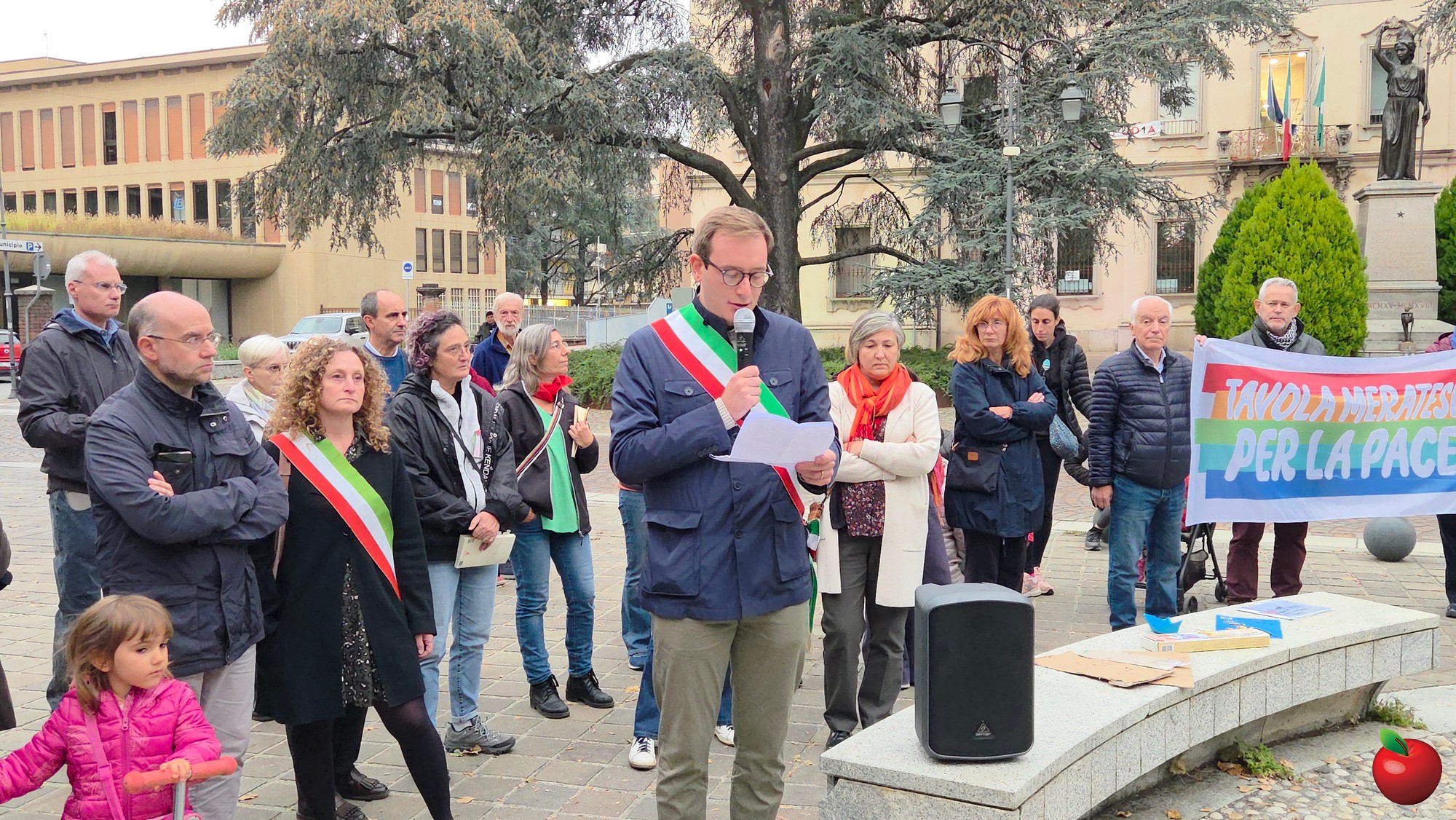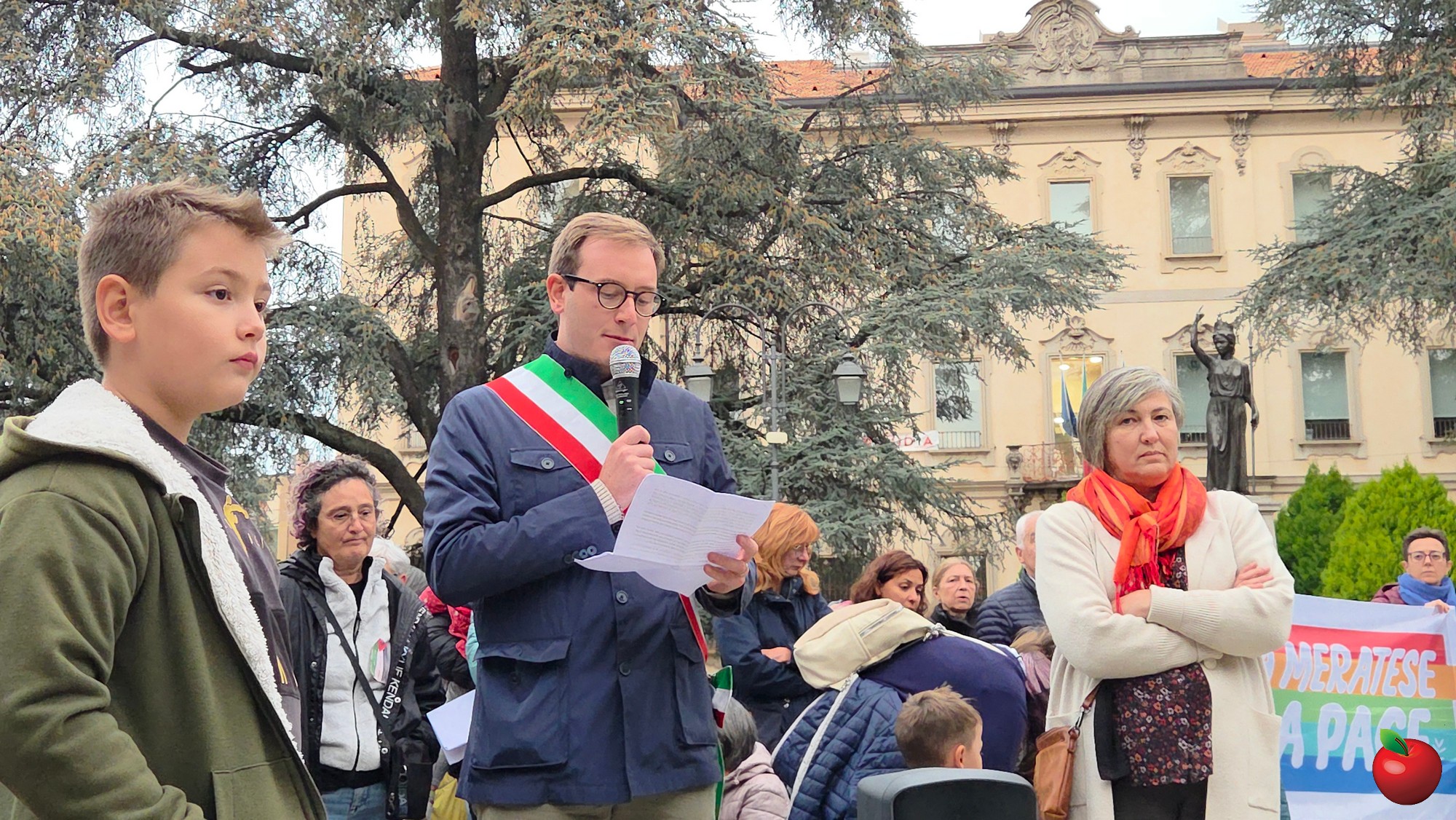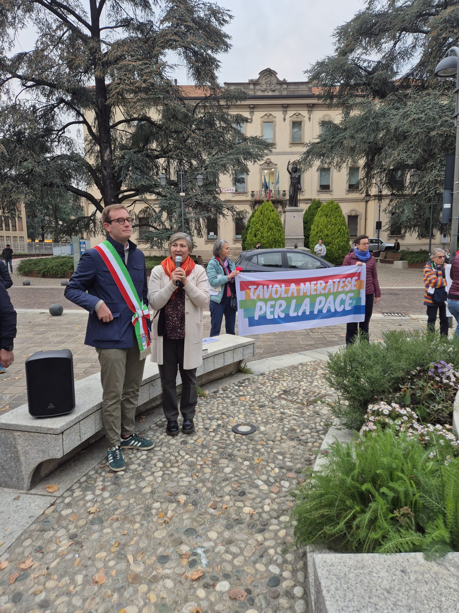 Con la fascia tricolore il sindaco Mattia Salvioni ha letto il suo messaggio di condanna di tutte le guerre, di vicinanza alle popolazioni affamate e dilaniate dai conflitti, di impegno affinchè dalla nostra città si “levi un grido di consapevolezza che non si può stare in silenzio, un grido di pace forte e inarrestabile. Da Merate noi possiamo essere testimoni dei valori di pace, libertà, democrazia e solidarietà”-