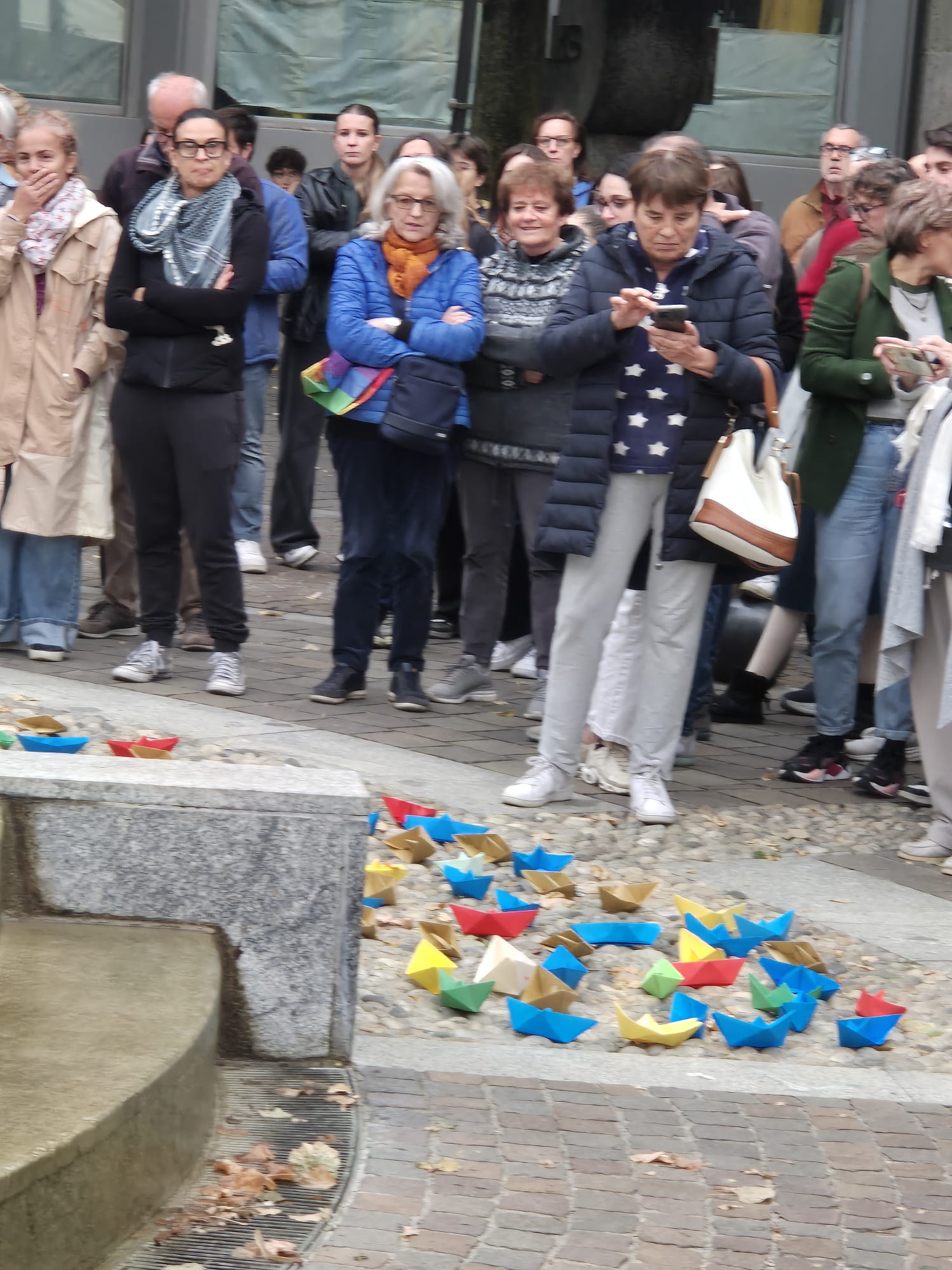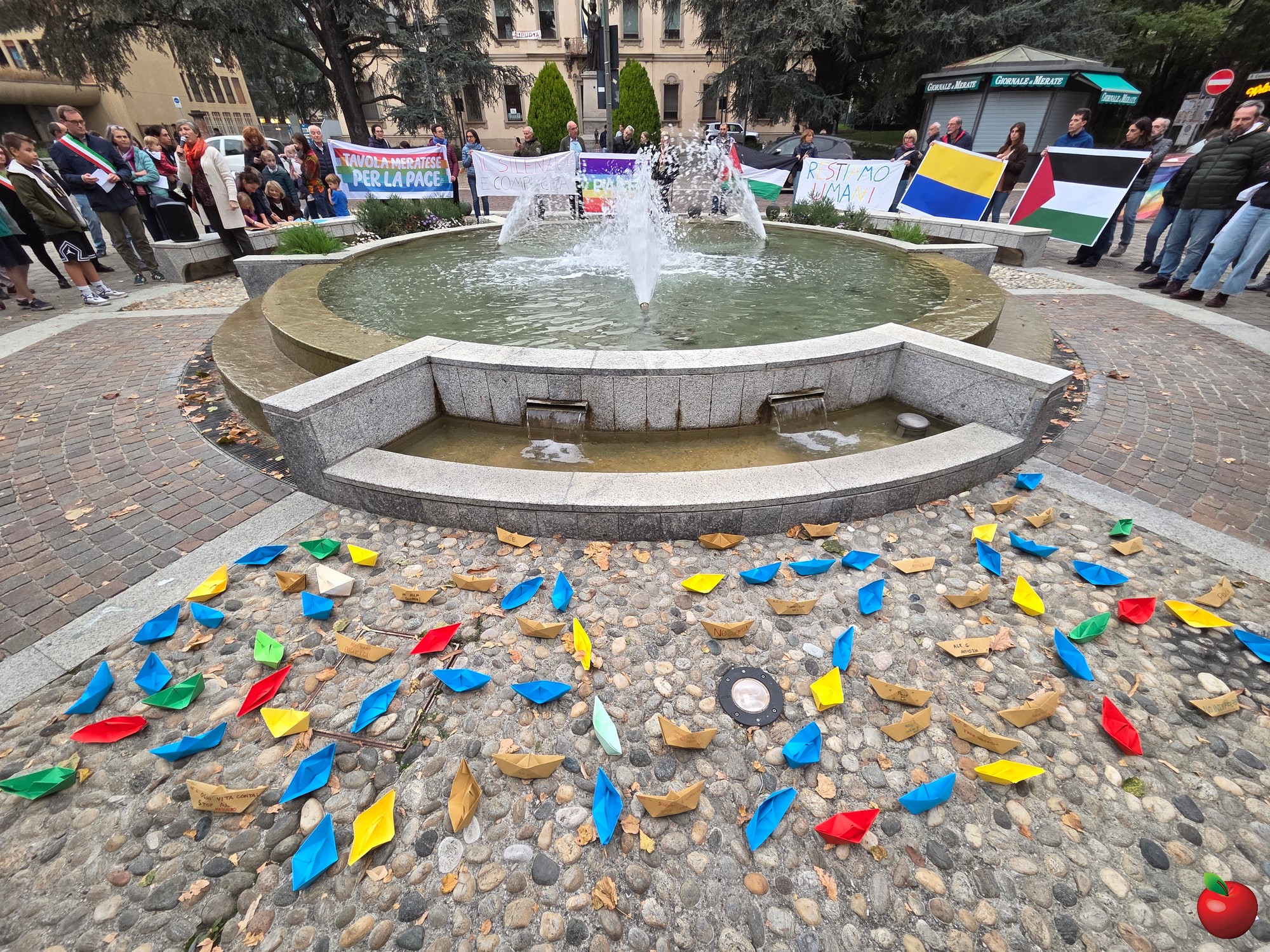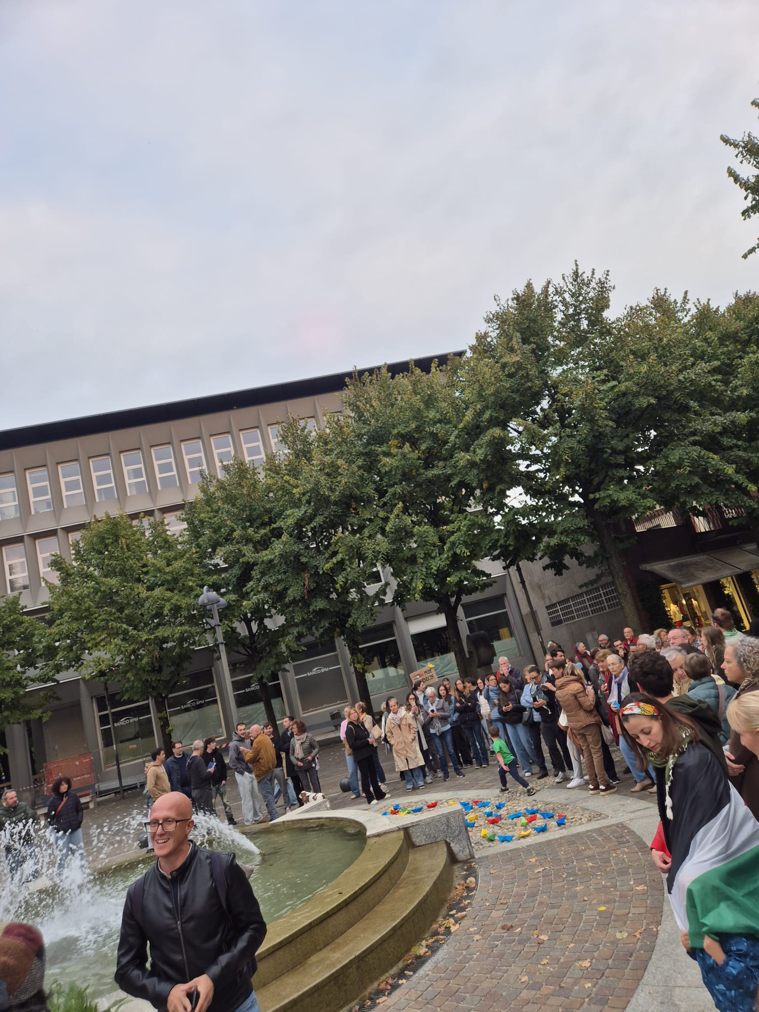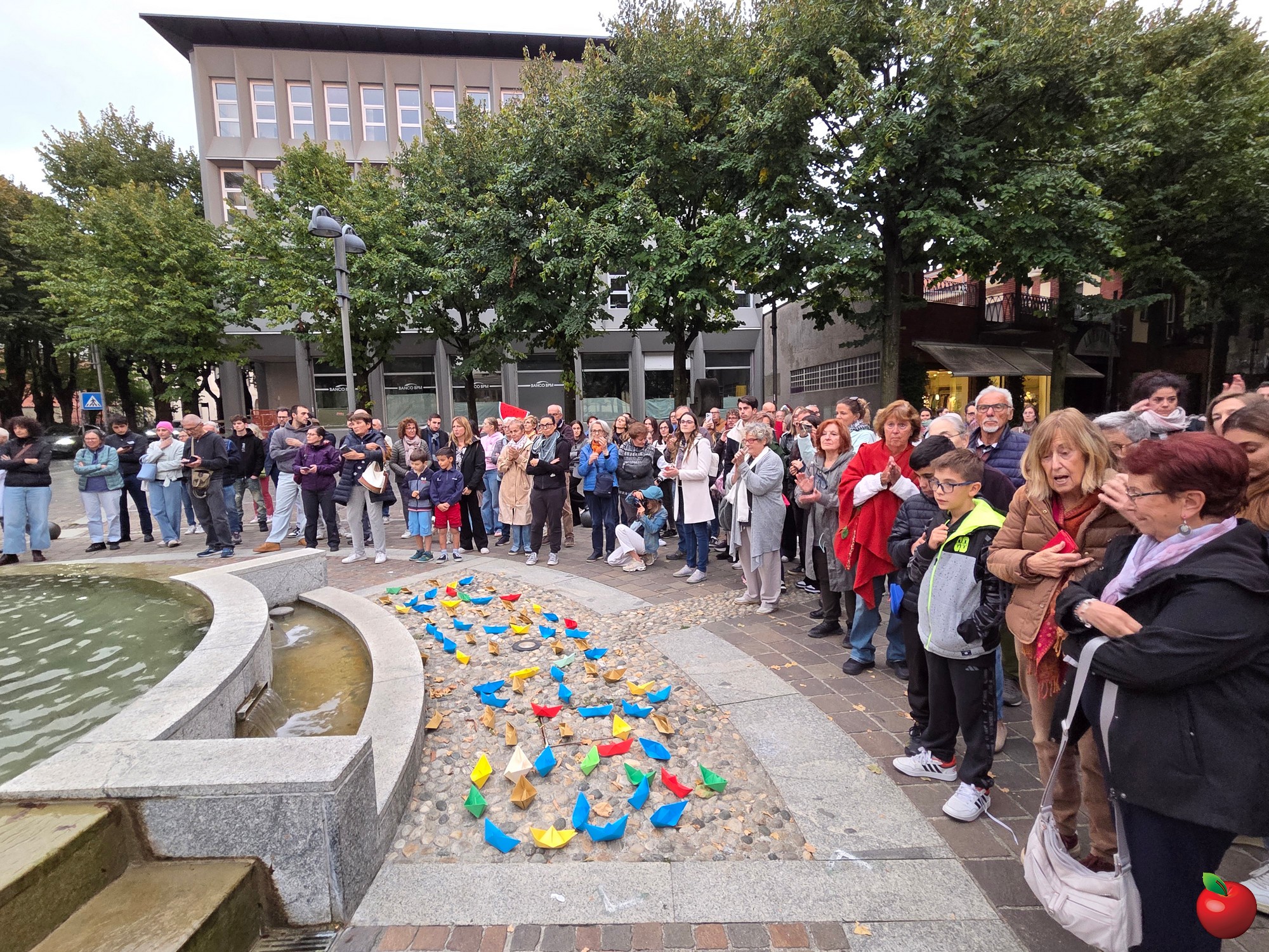 Dai bambini agli anziani, tutti si sono radunati attorno alla fontana, vista un po' come il mare che lambisce le terre del massacro, e qui con striscioni e barche colorate di carta, poi adagiate sull'acqua, hanno detto il loro no alla guerra e al ritorno a un dialogo costruttivo per un cessate il fuoco duraturo.